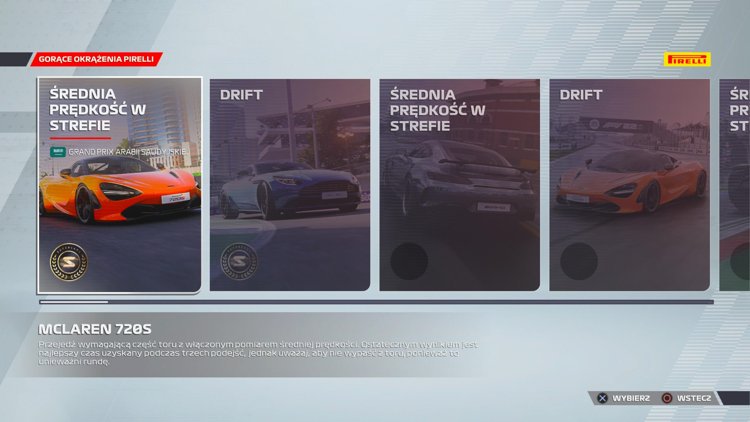 Jeżeli jazda supersamochodami spodoba wam się bardziej od prowadzenia bolidu, to możecie udać się do wspomnianego trybu Pirelli Hot Laps, aby zmierzyć się niemal z 40 wyzwaniami. Oprócz wspomnianej próby czasowej, wyzwania średniej prędkości, driftu i pojedynku 1 na 1 znajdziemy tu także autocross. Ten polega na pokonaniu toru, przejeżdżając przez każdą wirtualną bramkę z pachołkami przy krawędziach. Zahaczenie o pachołek lub ominięcie bramki nagrodzi nas karnymi sekundami. Z tych wszystkich zawodów najbardziej uciążliwy wydał mi się drift, ponieważ ustawienia sterowania bolidami, jak i supersamochodami są wspólne. To sprawia, że wspomagacze do prowadzenia bolidów niekoniecznie są dobre dla supersamochodów, a już szczególnie do driftowania nimi.