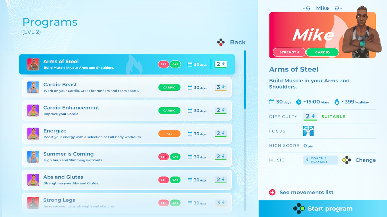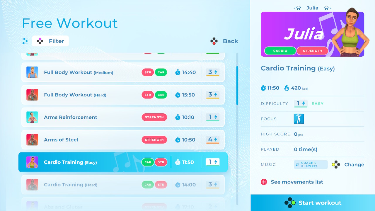 Każdy trening możemy na początku skonfigurować pod względem wybranych utworów, a także modelu trenera. Możemy na przykład wziąć trening Mike’a i po prostu zmienić wizerunek trenera co nie zmieni zestawu ćwiczeń. Niestety nie znalazłem opcji modyfikacji tych elementów w trakcie trwania programu. Wydaje mi się, że właśnie wtedy ta opcja mogłaby być najcenniejsza, choć sam na razie nie odczuwam znużenia ścieżką dźwiękową i trenerem. Tak jak już wspominałem, trening zajmie Wam kilkanaście minut, więc pomyślałem, że fajnie byłoby jednocześnie zapisać się na dwa programy treningowe jednocześnie. Niestety nie jest to możliwe… chyba że będziecie ćwiczyć w grze na wielu profilach jednocześnie. Nie znaczy to jednak, że jesteśmy skazani tylko na jeden trening dziennie.