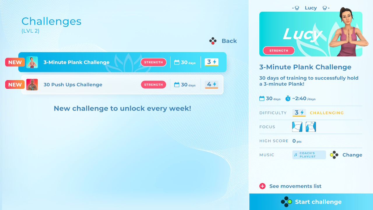Na tym jeszcze nie koniec, do wyboru mamy codzienne wyzwanie. Jest to jeszcze krótsza sekcja treningowa, ograniczająca się do jednego ćwiczenia. Na przestrzeni 30 dni dojdziemy na przykład do 30 powtórzeń pompek.