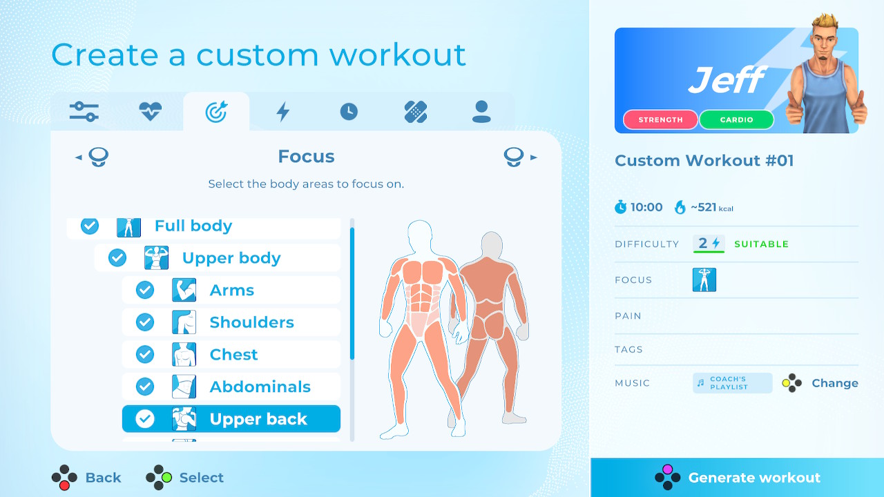 Trzeba bowiem wspomnieć o kolejnej opcji, jaką jest „otwarty trening”. Możemy wybrać coś z listy, albo skonfigurować własny. Wybierzemy konkretne partie mięśni, które chcemy ćwiczyć, a nawet ustawić obolałe miejsca ciała, których trening nie powinien dotyczyć.