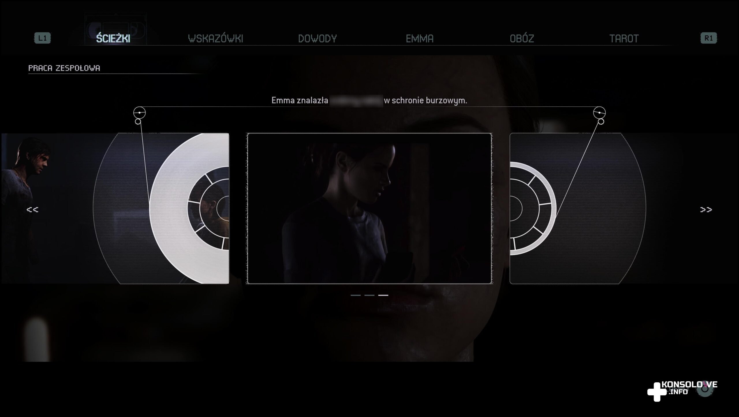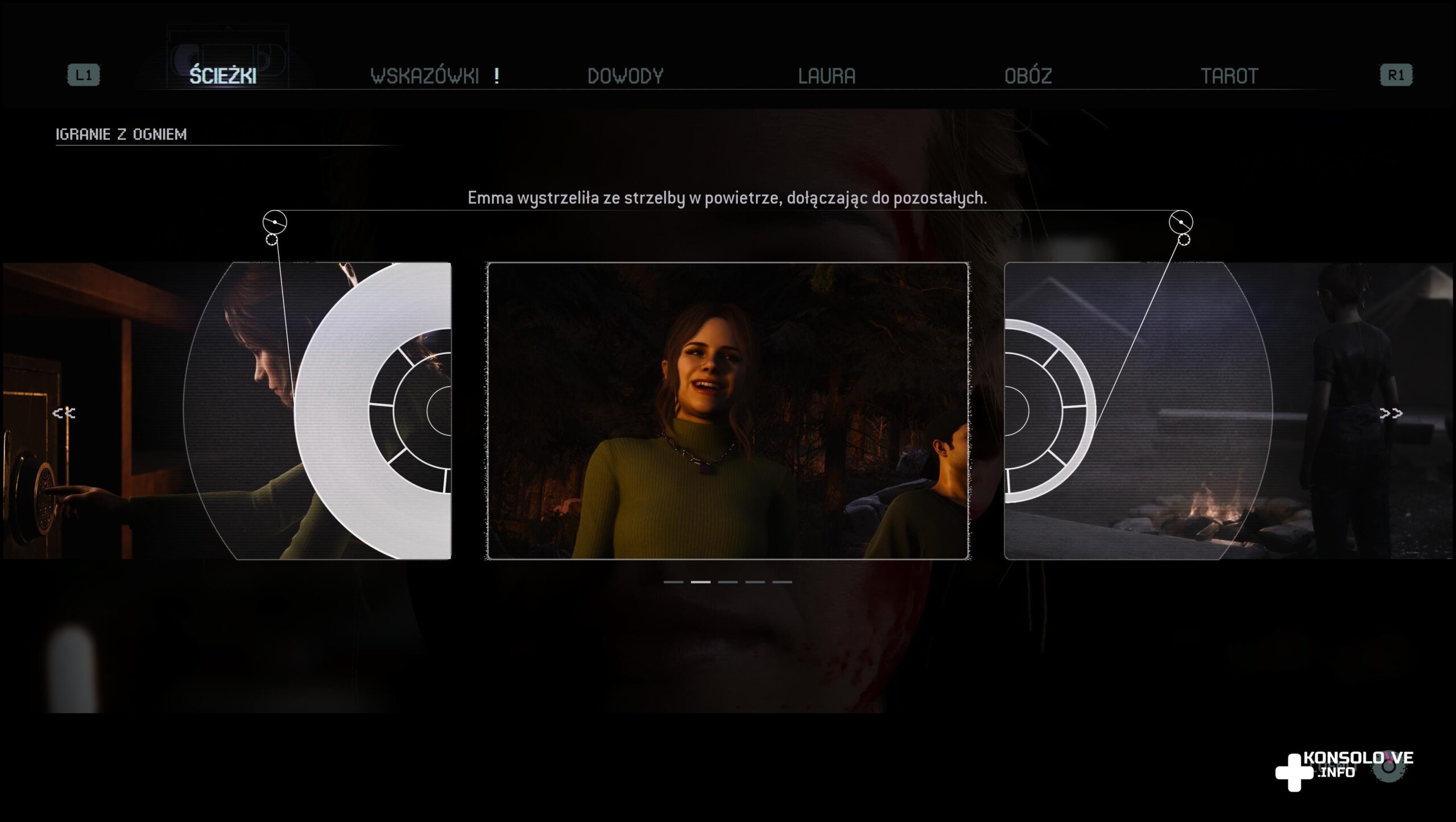 Miałem przyjemność ogrywania The Quarry w wersji na konsolę PlayStation 5. Brytyjczycy stojący za tą grą doskonale zdają sobie sprawę z możliwości zapewnianych przez sprzęt nowej generacji. Widać to przede wszystkim w błyskawicznych czasach ładowania. Zastosowanie dysku SSD przez Sony było strzałem w dziesiątkę, a Supermassive Games ewidentnie ma dobrze skalibrowany celownik. Czasy ładowania właściwie nie występują w recenzowanej produkcji i momentalnie przenosimy się do nowej postaci po zakończeniu fragmentu poświęconego poprzedniej. Podobnie szybko poruszamy się po menu znajdziek, w którym możemy raz jeszcze wyświetlić wizje tarota i podejrzeć dowody. Sprawdzimy tu również skutki podejmowanych przez nas decyzji. Nadal jednak tak samo jak w poprzednich grach występują problemy z kamerą. Manewrowanie przy zmieniającym się układzie kamery, zwłaszcza w małych pomieszczeniach, potrafi irytować.