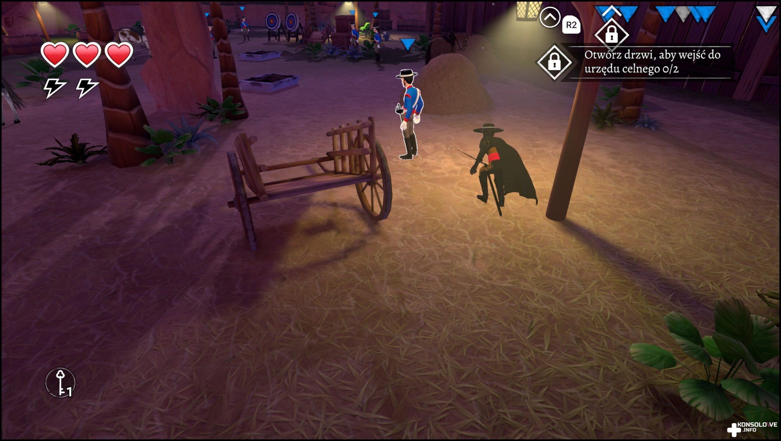Obszary, jakie przyjdzie nam zwiedzać nie są co prawda przesadnie rozległe. Nie zmienia to jednak faktu, że zapewniają nam one pewną dozę swobody. Dzięki temu czasem możemy zadecydować, co preferujemy: otwarty konflikt, czy ciche zdejmowanie strażników. Jeśli najbardziej cenicie to drugie, to mam dla Was dobrą wiadomość. W Zorro: The Chronicles można bowiem odwracać uwagę przeciwników (oraz zaznaczać ich, korzystając z podręcznej lunety). Następnie wystarczy nacisnąć lewą gałkę analogową, a wejdziemy w tryb skradania. Teraz musimy pójść za plecy naszego oponenta, gdzie – po wyświetleniu opcji dyskretnej eliminacji – naciśniemy kwadrat, za pomocą którego bezszelestnie załatwimy wroga. Możemy tego dokonać również atakując go z góry, siedząc na jakimś balkonie lub żerdzi. Do tego dochodzi jeszcze opcja rzucania kamykami (mamy ich nieograniczoną ilość), aby odciągnąć przeciwnika w miejsce rzutu. Oponenci nie odznaczają się jednak wysokim poziomem sztucznej inteligencji i w zasadzie działają zero-jedynkowo. Z pewnością nie jest to poziom znany z najlepszych skradanek. Zorro: The Chronicles to wyraźnie gra, w której skradanie jest zaledwie jednym ze sposobów przechodzenia fragmentów poziomów. Strażników nie wzrusza widok ogłuszonych kolegów – nie wspominając nawet o tym, że nie próbują ich ocucić.