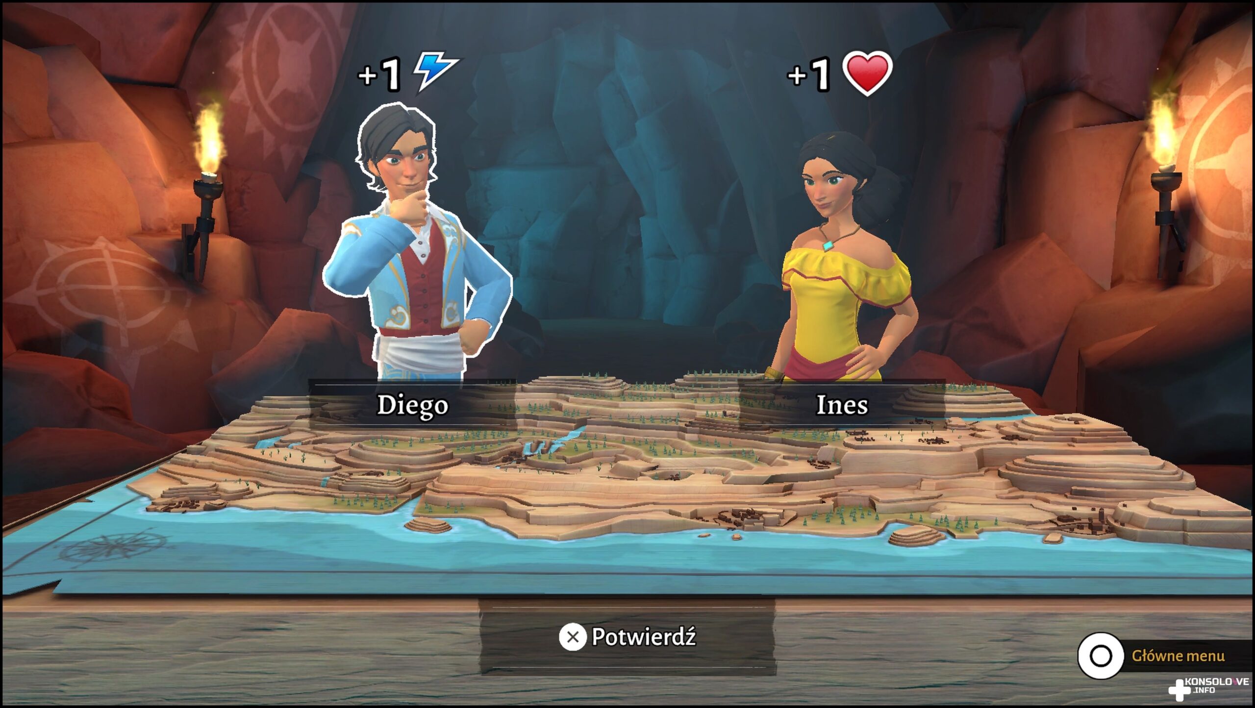Każdy, kto oglądał serial Kroniki Zorro, doskonale z pewnością zdaje sobie sprawę, że Diego de la Vega nie jest jedyną postacią, która zakładała czarny kostium. Twórcy recenzowanej gry również o tym wiedzą, wobec czego oddali nam możliwość wcielenia się w siostrę Diego – Ines. Wyboru postaci dokonujemy z mapy misji (bez problemu można powracać do uprzednio ukończonych etapów). Jeśli liczyliście na zmianę zachowania i dostępnych opcji w zależności od wybranej postaci, to mam dla Was złą wiadomość. Płeć Zorro wpływa bowiem wyłącznie na animacje specjalnych ataków, wygląd oraz głos. Rozgrywka nie różni się absolutnie niczym oprócz jednej kwestii. I tak Diego posiada jedno dodatkowe serce (zdrowie), natomiast Ines opisaną wcześniej błyskawicę.