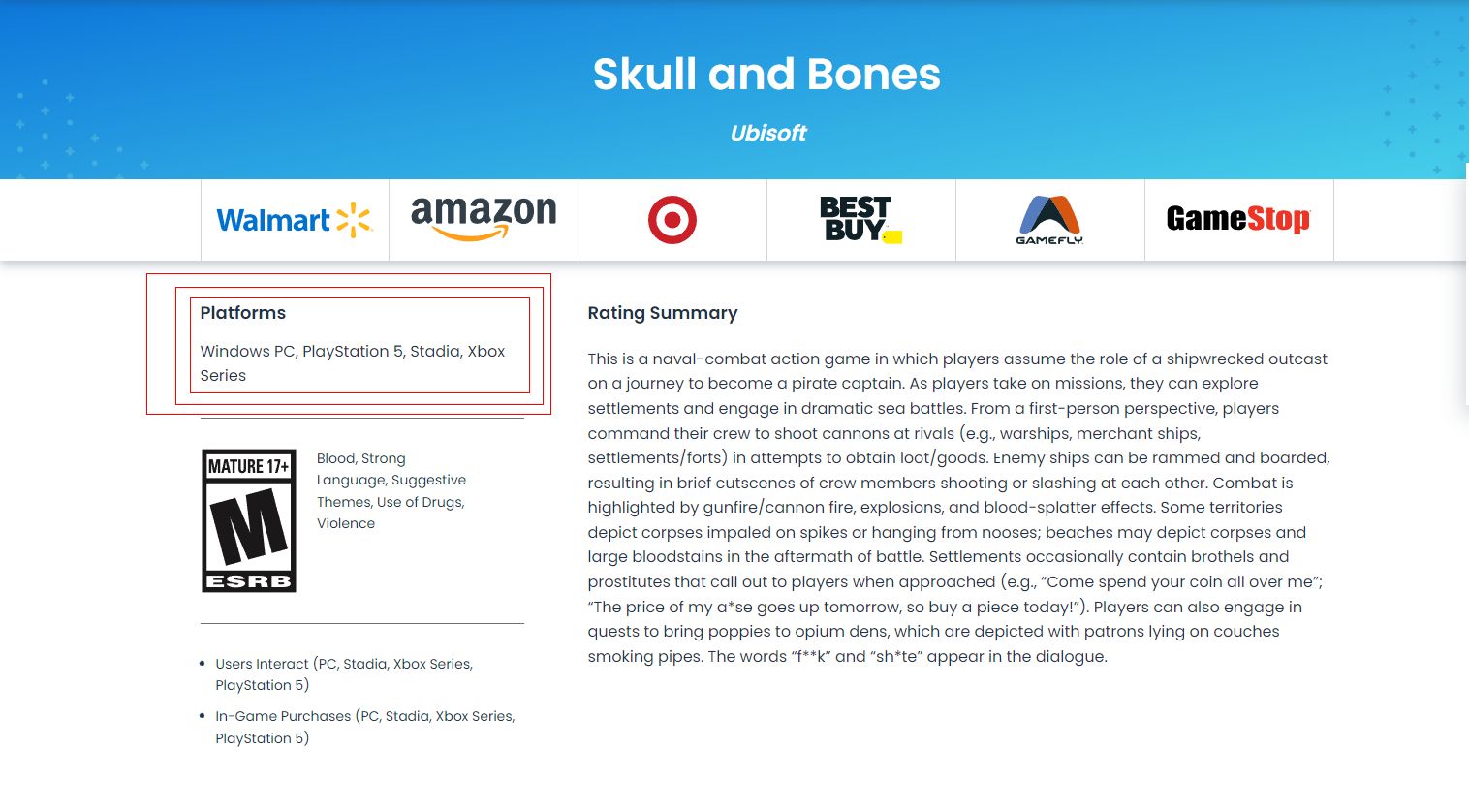 Skull and Bones (oprócz zamienienia znaku & na słowne and w nazwie) doczekało się prawdopodobnie istotnej zmiany. Mianowicie, jak można wyczytać na stronie gry na ESRB, produkcja może trafić tylko na nową generację konsol.