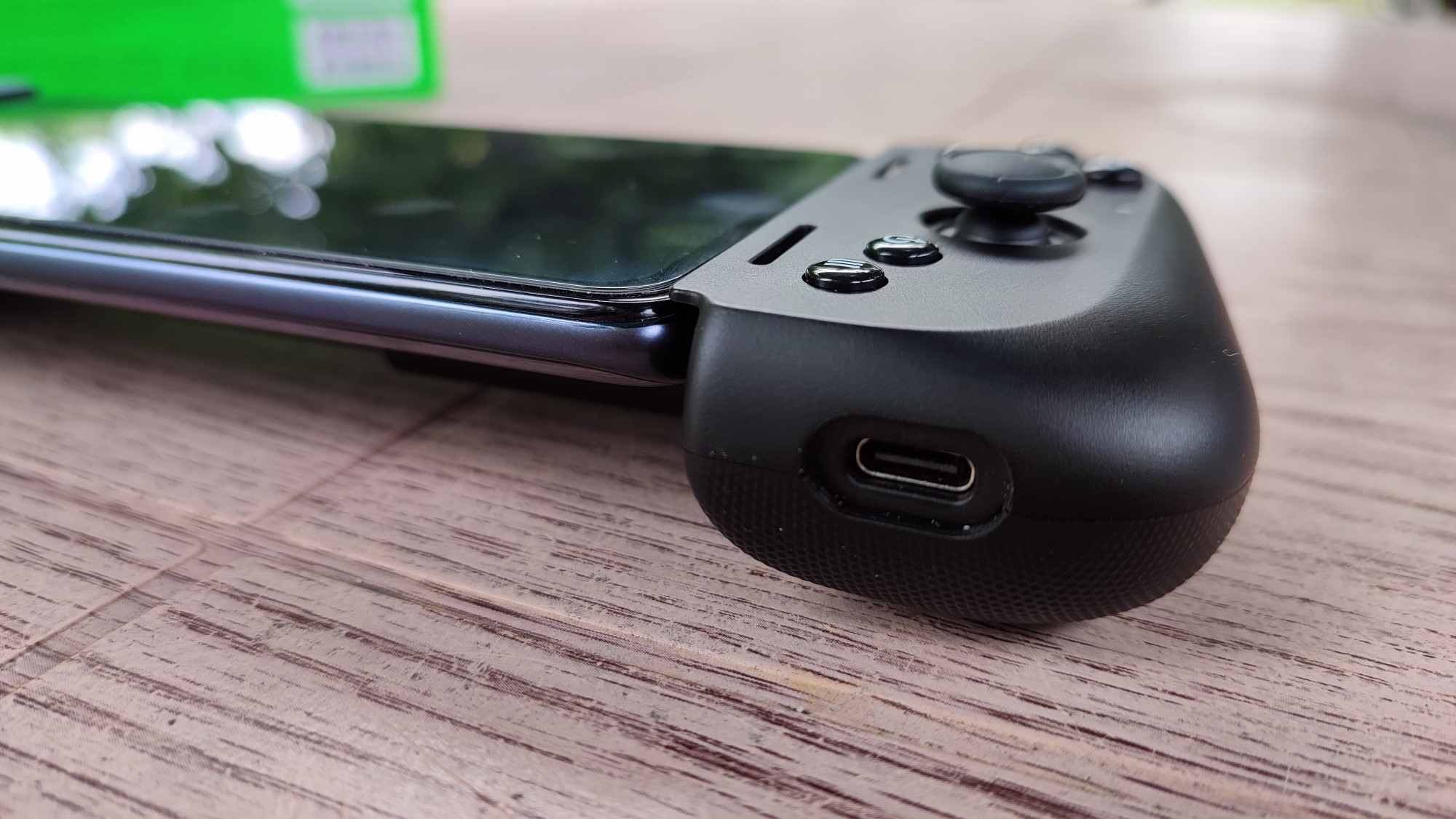Ramiona kontrolera są niemal identyczne co Joy-Cony japońskiego producenta. Między nimi natomiast umieszczono rozsuwany pałąk, do którego wsuwamy smartfona. Ten nie może mieć większych wymiarów niż 170 mm długości oraz 11.5 mm grubości wraz z aparatami. Koniecznie musi posiadać gniazdo USB-C oraz system android 9.0 lub nowszy. Razer Kishi V2 to bardzo mała i delikatna konstrukcja, przez co na wyposażeniu nie znajdziemy wbudowanego akumulatora. Kontroler zasilany jest bezpośrednio ze smartfona. Ewentualnie możemy podłączyć powerbank lub ładowarkę z końcówką USB-C do prawego ramienia, aby naładować w trakcie rozgrywki smartfona. Należy mieć na uwadze, że wspomniany port USB-C służy tylko do ładowania i nie obsługuje on żadnych urządzeń zewnętrznych, czy audio.