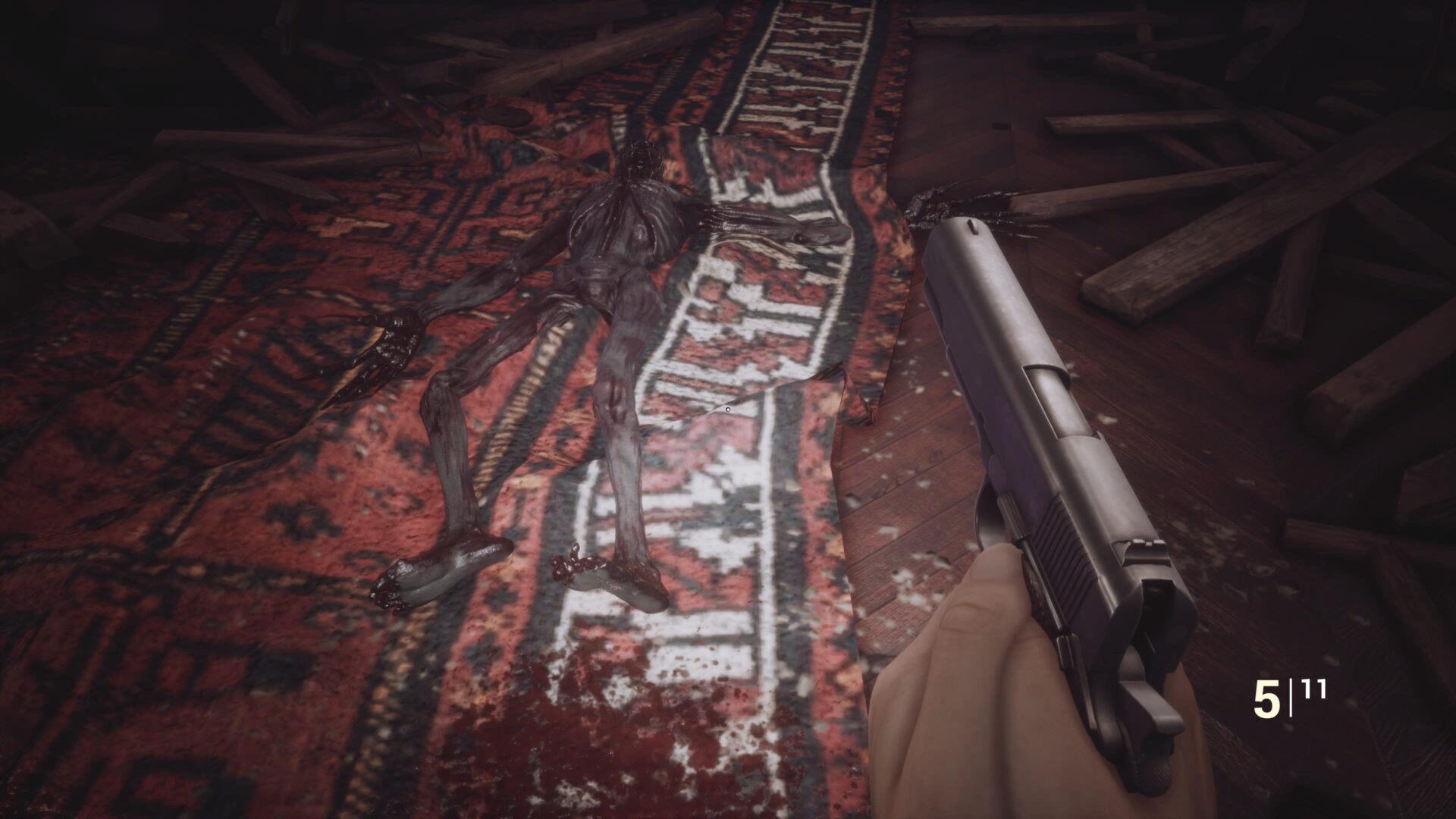 Zbierając itemy, części oraz kostki umożliwiające ulepszenie wyposażenia, w pewnym momencie napotkamy… pistolet. W FOBIA – St. Dinfna Hotel po prostu nie mogło zabraknąć mojego ulubionego strzelania. Jak ono działa? Słabo. Przede wszystkim ciężko jest wycelować, mimo iż mamy do tego wspomaganie. Strzelanie w potwory zużywa od 3 do 4 kul, co w późniejszych etapach rozgrywki jest dużą ilością (nawet za dużą). Pokonanie jednego bossa zajęło naprawdę sporo czasu. Dlaczego? Ponieważ nad potworami nie ma pasku z poziomem ich życia. Strzelamy i czekamy, aż po siedmiu minutach przeciwnik w końcu się przewróci. Jest to bardzo męczące, nawet posiadając kilka różnych rodzajów broni.