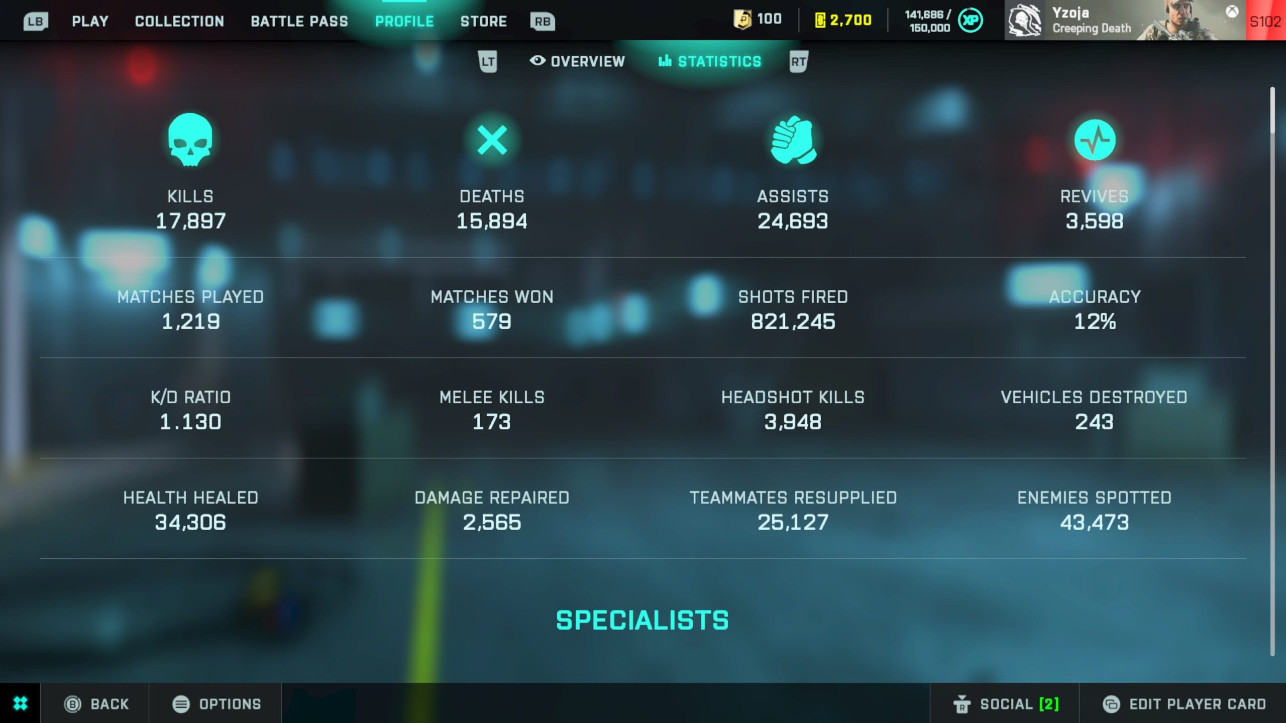 W sekcji statystyk mamy jeden dłuuuuuugi ekran, pełen podzielonych wskaźników. Obok podstawowych statystyk jak ilość śmierci, zabójstw, asyst czy zagranych gier, znajdziemy też podgląd specjalistów i poziomów na nich, zabójstw, i tak dalej. Jest też sekcja z mapami czy trybami gry, gdzie dowiemy się, ile godzin spędziliśmy na rozgrywce.