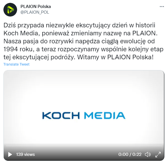 Koch Media GmbH ogłasza, że od dziś wszystkie oddziały Koch Media na całym świecie zmieniają nazwę na PLAION, razem z pełną wymianą znaków towarowych.