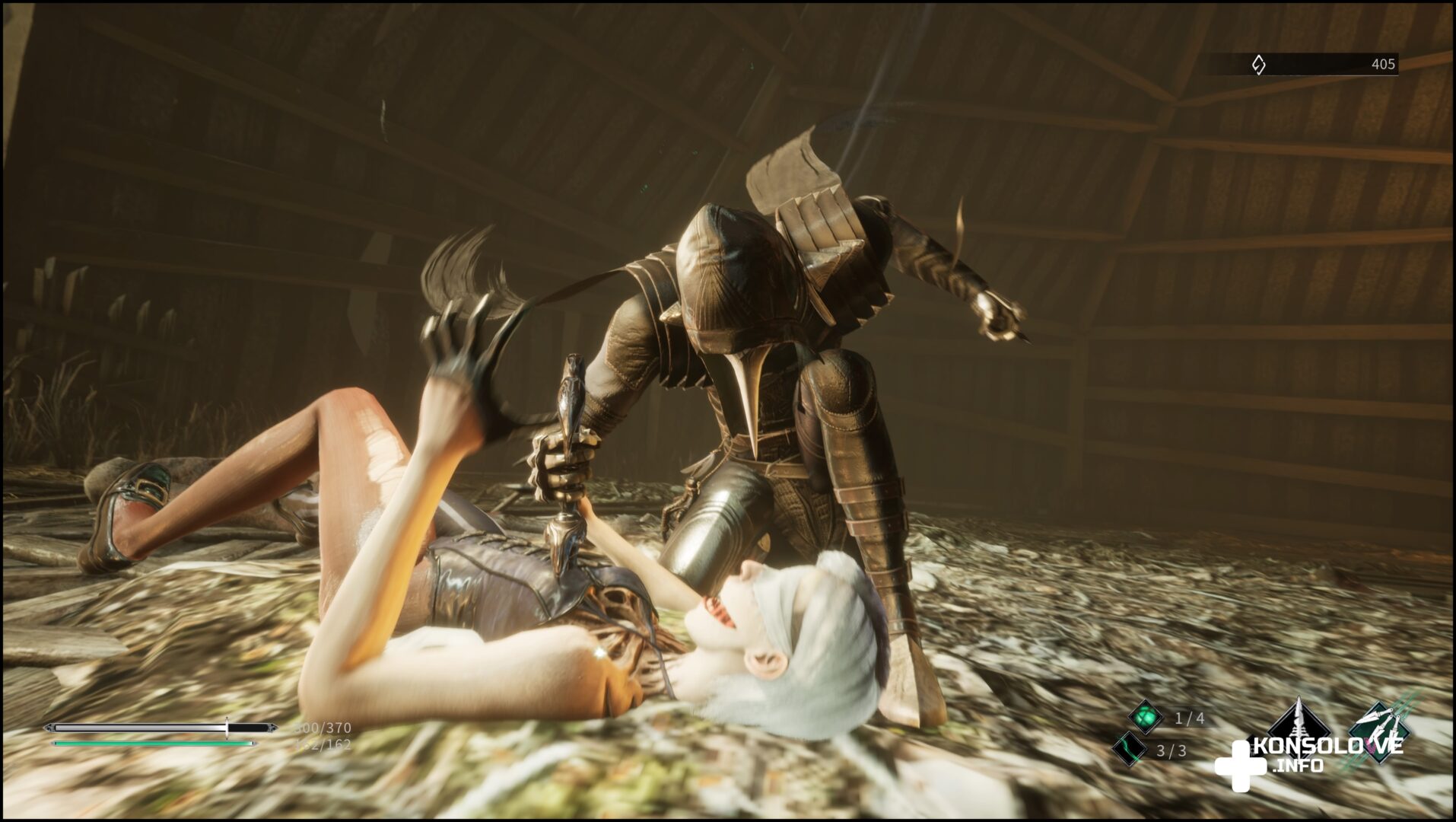 W odróżnieniu od wielu gier z gatunku souls-like, Thymesia posiada interesującą mechanikę starć, którą warto wyjaśnić. Mianowicie, atakując przeciwników nie zadamy im od razu obrażeń. Zamiast tego w nałożone zostaną na nich rany. Jeśli nie skorzystamy teraz z ataku rękawicą (prawy spust), to zdrowie przeciwnika powoli będzie się regenerowało. Alternatywnie możemy ustawicznie atakować, przebijając się ostatecznie przez ochronną warstwę ran. Nasz wróg bynajmniej nie będzie stał bezczynnie. Nieustannie musimy uważać, czy wyprowadza swoje ciosy – możemy ich uniknąć odpowiednim uskokiem, czy skontrować własnym uderzeniem za pomocą lewego bumpera. Trzeba jednocześnie zaznaczyć, że okno czasowe na kontrę jest bardzo krótkie. Niekiedy oponent może wyprowadzić też atak specjalny lub krytyczny. Tego (domyślnie) nie zablokujemy, ale możemy go przerwać. Kiedy zobaczymy zielony błysk, naciskamy lewy spust, a Corvus rzuci nóż, uniemożliwiając wyprowadzenie wspomnianego ataku. Margines czasowy również tu jest bardzo krótki, przez co podczas walk musimy mieć się nieustannie na baczności. Przyznaję, że po początkowej niechęci do takiego systemu zmagań, nie minęło wiele czasu, a polubiłem tę mechanikę. Dzięki niej starcia są wymagające i tym bardziej zależy nam na uważnym zwiedzaniu lokacji.