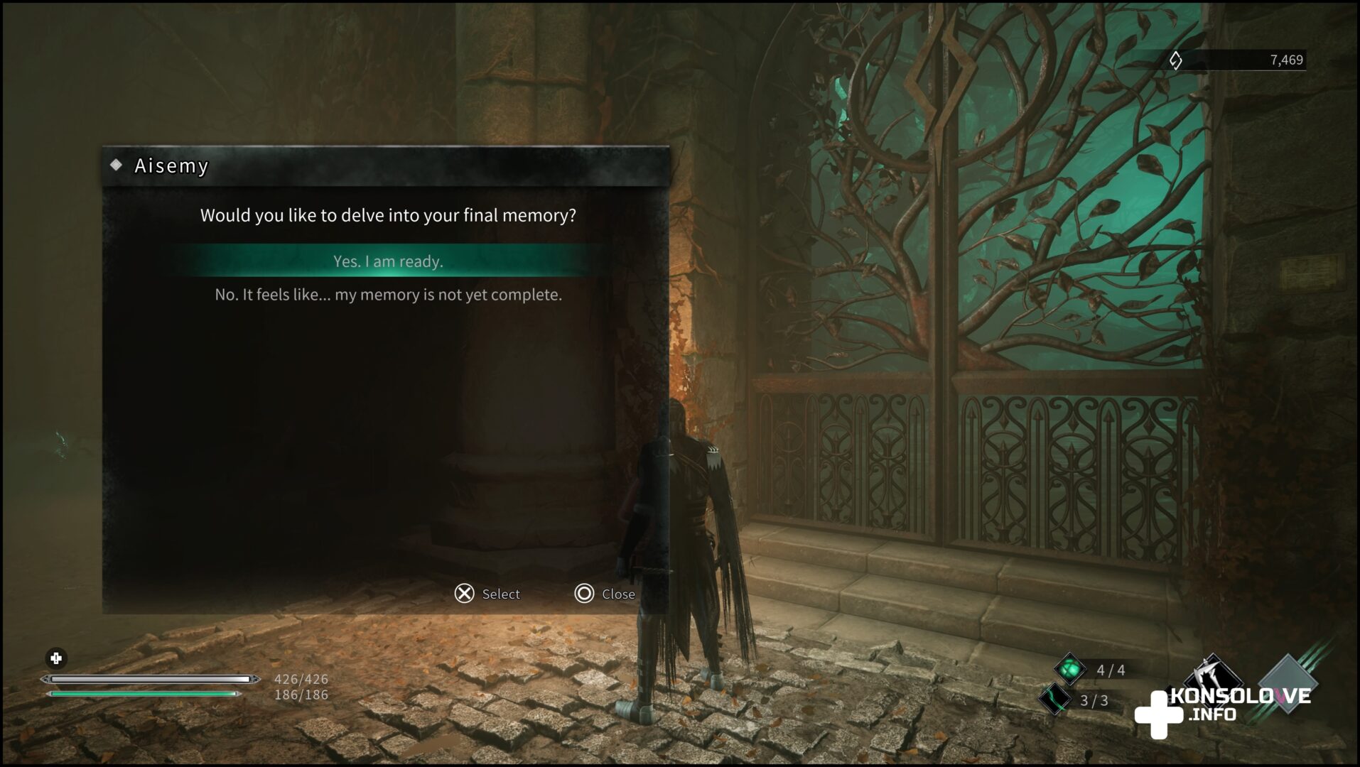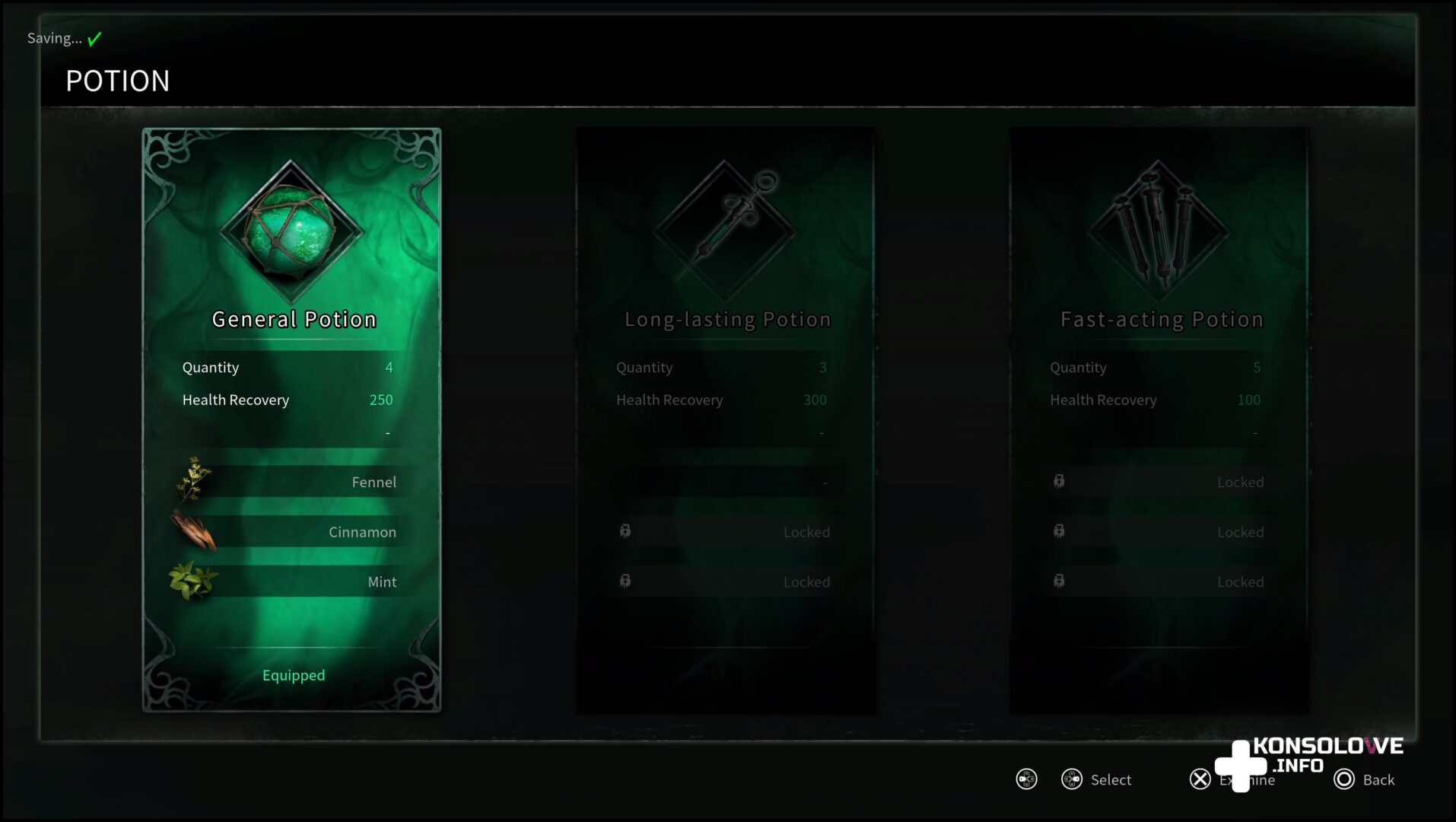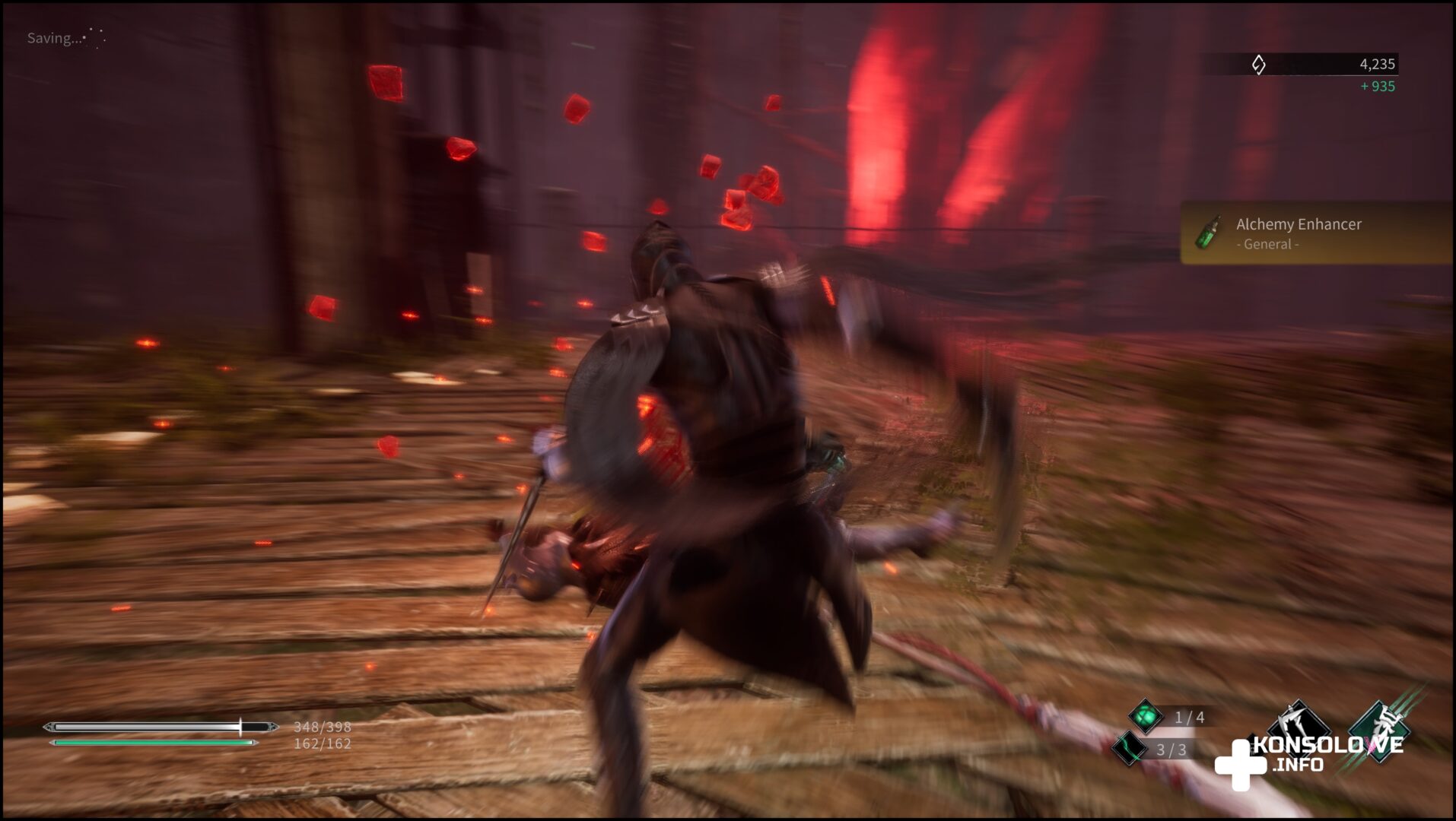 Jak przystało na grę souls-like, nie może w niej zabraknąć rozwoju. Twórcy Thymesia zdają sobie z tego sprawę. W związku z tym nasze umiejętności i parametry możemy rozwijać w kilku kierunkach. Oczywiście, standardowo dla reprezentowanego gatunku, wzmacniać możemy się wyłącznie przy ognis… to znaczy, przy specjalnych tronach z zieloną poświatą. Wciskając w ich pobliżu trójkąt, wejdziemy w interakcję, po czym będziemy mogli wybrać jedną z kilku opcji. Jedną z nich jest ulepszenie eliksiru czy strzykawki – to bynajmniej nie wszystkie specyfiki lecznicze, aczkolwiek nie będę Wam zdradzał ich wszystkich. Zebrawszy wymaganą ilość specjalnych znajdziek, możemy zwiększyć ilość odnawianego zdrowia, liczbę tych specyfików czy niezbędne do ich ulepszania składniki.