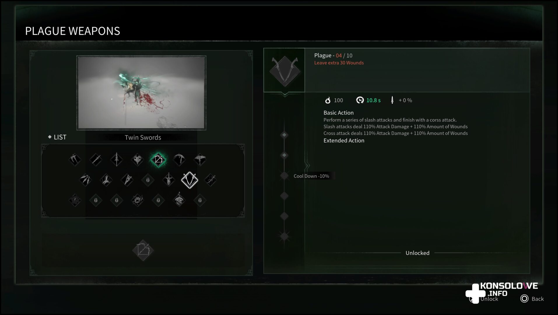 Nie mogę nie wspomnieć o elemencie, który był dość silnie promowany przed premierą gry. Chodzi oczywiście o tak zwane bronie plagi. Na odblokowanie czeka ponad dwadzieścia rodzajów tego oręża. Trzeba zaznaczyć, że nie różnią się one od sobą wyłącznie animacją. Odznaczają się bowiem różną wartością oraz rodzajem obrażeń i, oczywiście, kosztem w energii. Bronie plagi nierzadko pozwalają zwycięsko wyjść ze starcia z bossem – zadają bowiem godną uwagi ilość ran. Dodajmy jeszcze do tego nakładanie krwawienia na oponenta – umiejętność do wykupienia – a otrzymamy bardzo przystępny poziom trudności jak na ten gatunek. Dodatkowo możemy wzmacniać te bronie, przeznaczając na to odpowiednie fragmenty, wypadające losowo z przeciwników.