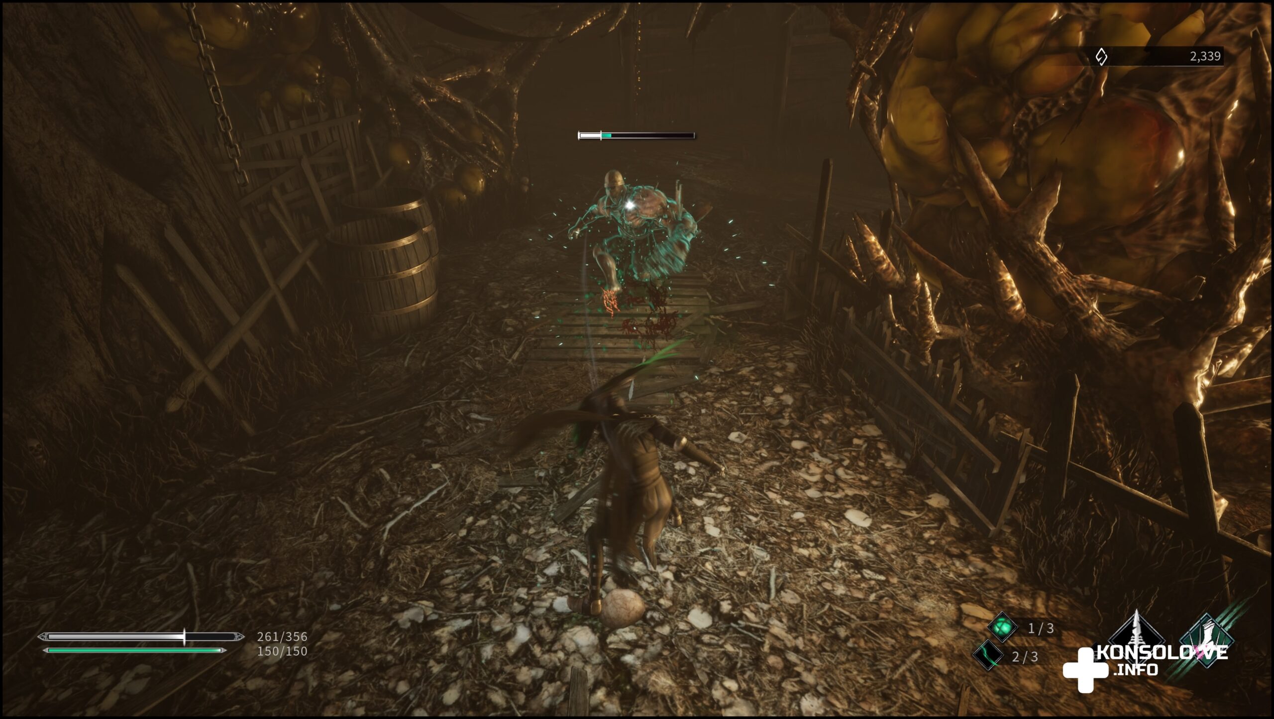 W odróżnieniu od wielu gier z gatunku souls-like, Thymesia posiada interesującą mechanikę starć, którą warto wyjaśnić. Mianowicie, atakując przeciwników nie zadamy im od razu obrażeń. Zamiast tego w nałożone zostaną na nich rany. Jeśli nie skorzystamy teraz z ataku rękawicą (prawy spust), to zdrowie przeciwnika powoli będzie się regenerowało. Alternatywnie możemy ustawicznie atakować, przebijając się ostatecznie przez ochronną warstwę ran. Nasz wróg bynajmniej nie będzie stał bezczynnie. Nieustannie musimy uważać, czy wyprowadza swoje ciosy – możemy ich uniknąć odpowiednim uskokiem, czy skontrować własnym uderzeniem za pomocą lewego bumpera. Trzeba jednocześnie zaznaczyć, że okno czasowe na kontrę jest bardzo krótkie. Niekiedy oponent może wyprowadzić też atak specjalny lub krytyczny. Tego (domyślnie) nie zablokujemy, ale możemy go przerwać. Kiedy zobaczymy zielony błysk, naciskamy lewy spust, a Corvus rzuci nóż, uniemożliwiając wyprowadzenie wspomnianego ataku. Margines czasowy również tu jest bardzo krótki, przez co podczas walk musimy mieć się nieustannie na baczności. Przyznaję, że po początkowej niechęci do takiego systemu zmagań, nie minęło wiele czasu, a polubiłem tę mechanikę. Dzięki niej starcia są wymagające i tym bardziej zależy nam na uważnym zwiedzaniu lokacji.