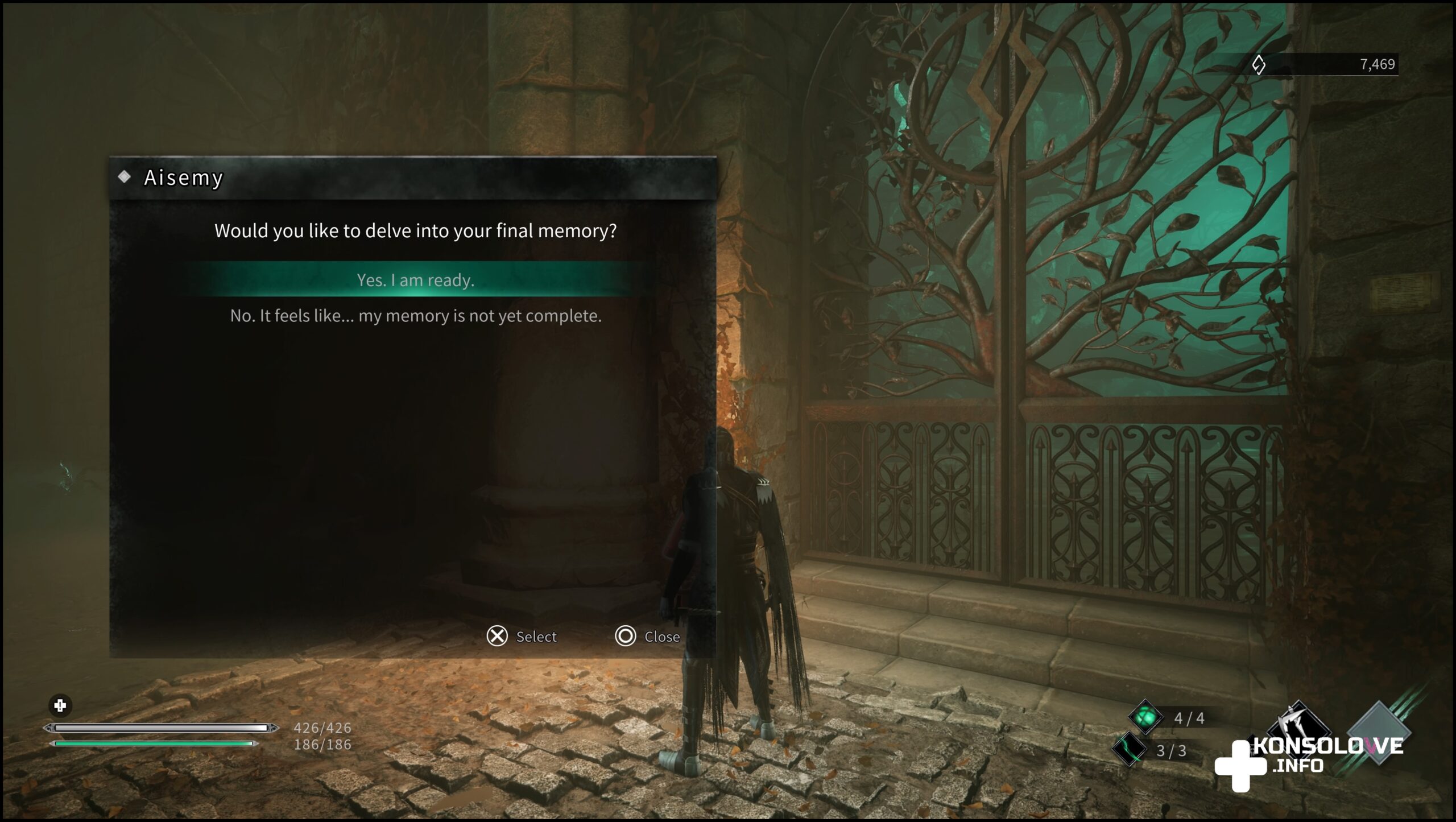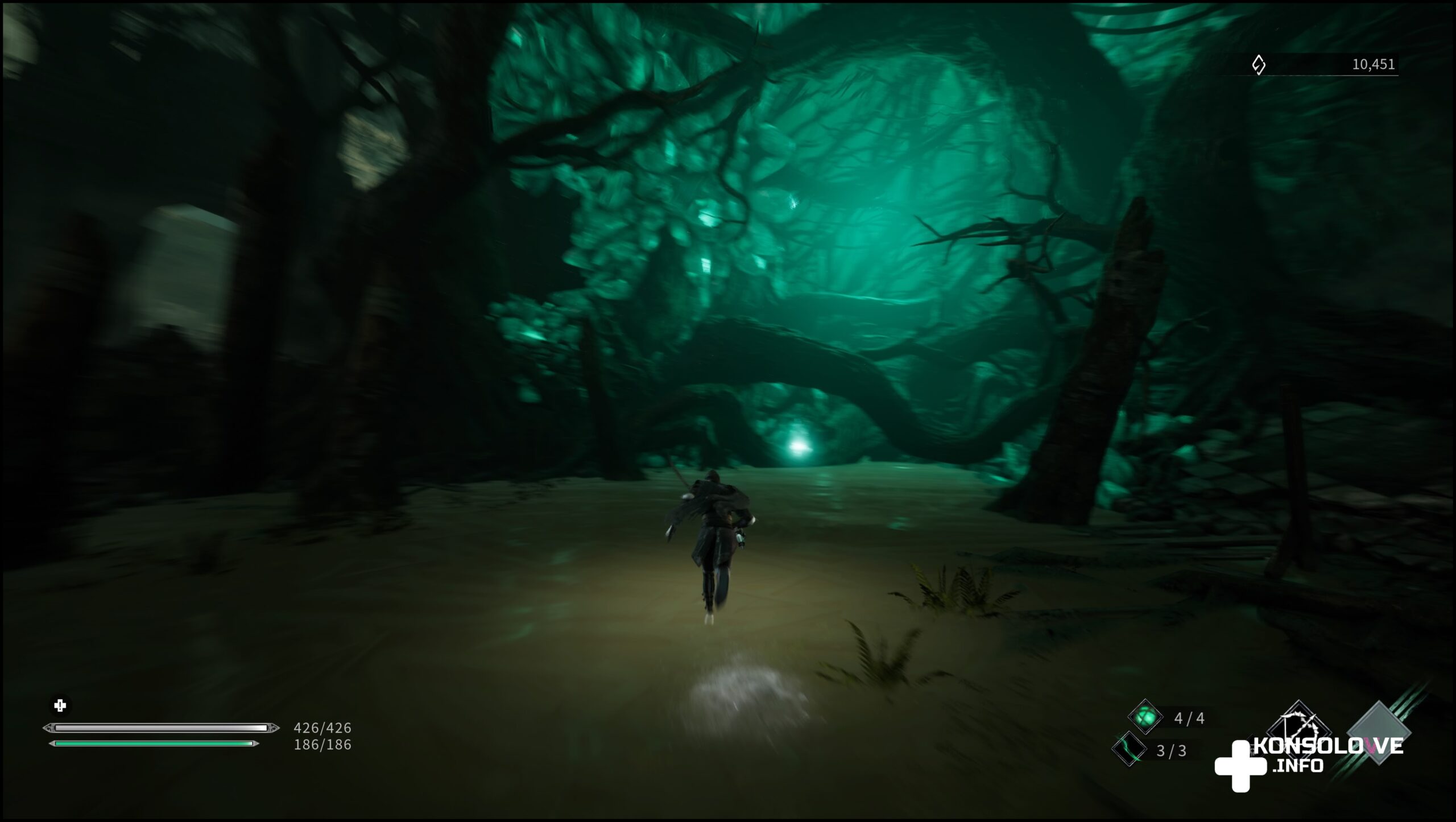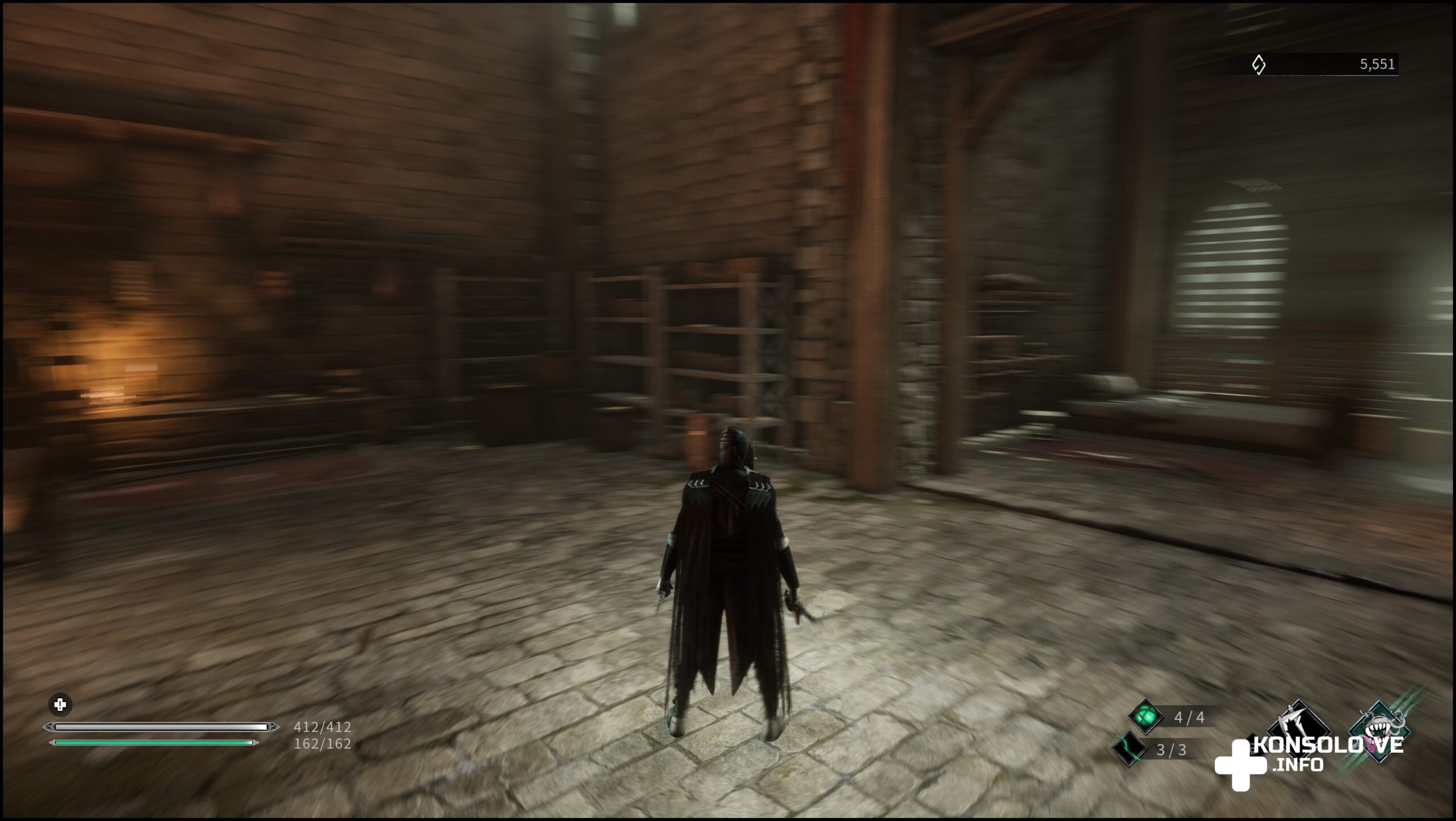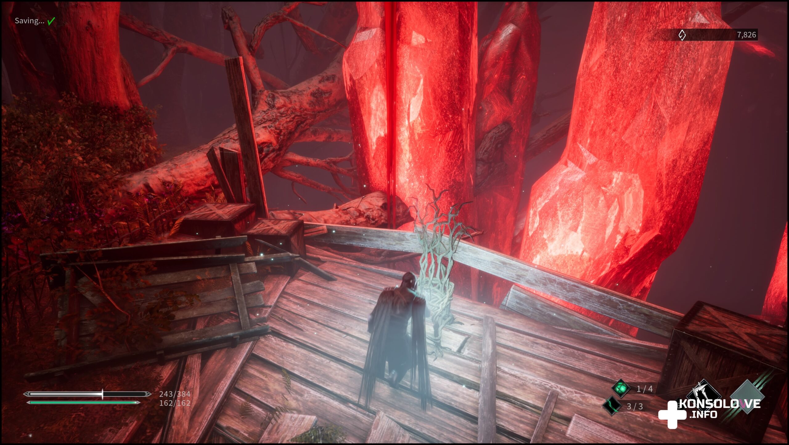 Jak przystało na grę souls-like, nie może w niej zabraknąć rozwoju. Twórcy Thymesia zdają sobie z tego sprawę. W związku z tym nasze umiejętności i parametry możemy rozwijać w kilku kierunkach. Oczywiście, standardowo dla reprezentowanego gatunku, wzmacniać możemy się wyłącznie przy ognis… to znaczy, przy specjalnych tronach z zieloną poświatą. Wciskając w ich pobliżu trójkąt, wejdziemy w interakcję, po czym będziemy mogli wybrać jedną z kilku opcji. Jedną z nich jest ulepszenie eliksiru czy strzykawki – to bynajmniej nie wszystkie specyfiki lecznicze, aczkolwiek nie będę Wam zdradzał ich wszystkich. Zebrawszy wymaganą ilość specjalnych znajdziek, możemy zwiększyć ilość odnawianego zdrowia, liczbę tych specyfików czy niezbędne do ich ulepszania składniki.