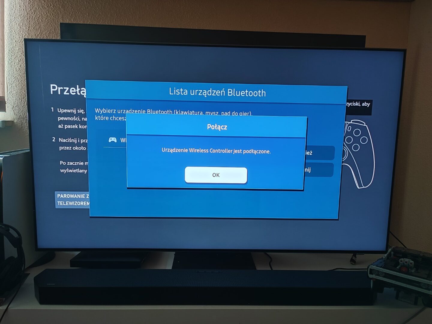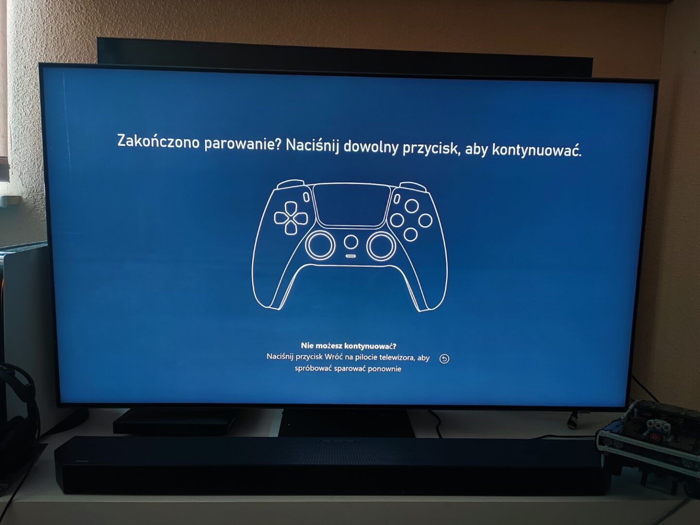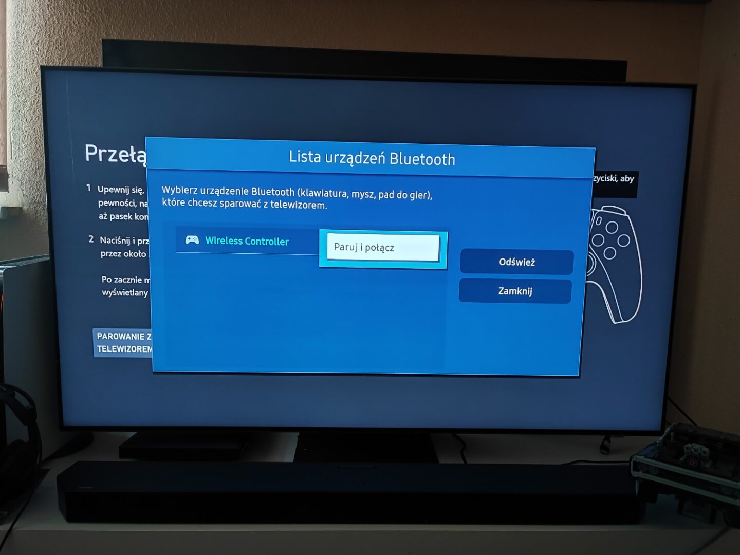 Z listy dostępnych kontrolerów wybieramy nasz model. Następnie na padzie przytrzymujemy przez trzy sekundy przycisk Share, dzięki któremu urządzenie przejdzie w stan parowania. Jeżeli telewizor wykryje kontroler, to na ekranie pojawi się odpowiedni komunikat. Wybieramy nasze urządzenie z listy, po czym naciskamy “paruj i połącz”. Gdy na ekranie zobaczymy komunikat “urządzenie wireless controller jest podłączone”, to znaczy, że wszystko dobrze zrobiliśmy i możemy zacząć grać.