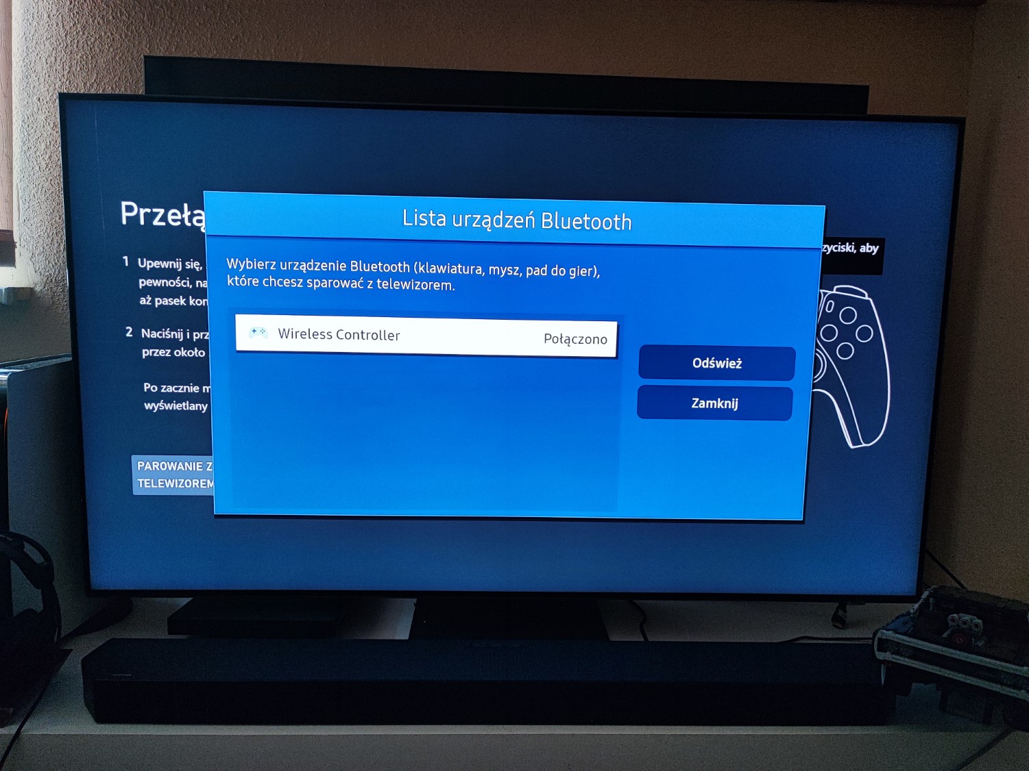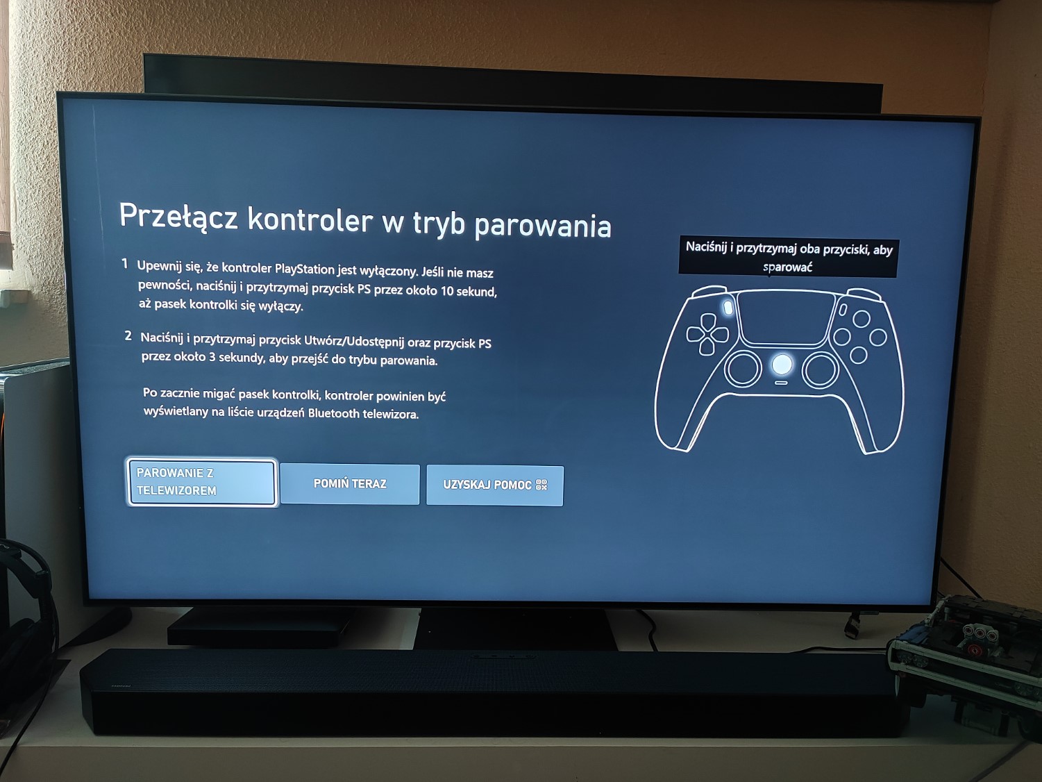 Z listy dostępnych kontrolerów wybieramy nasz model. Następnie na padzie przytrzymujemy przez trzy sekundy przycisk Share, dzięki któremu urządzenie przejdzie w stan parowania. Jeżeli telewizor wykryje kontroler, to na ekranie pojawi się odpowiedni komunikat. Wybieramy nasze urządzenie z listy, po czym naciskamy “paruj i połącz”. Gdy na ekranie zobaczymy komunikat “urządzenie wireless controller jest podłączone”, to znaczy, że wszystko dobrze zrobiliśmy i możemy zacząć grać.