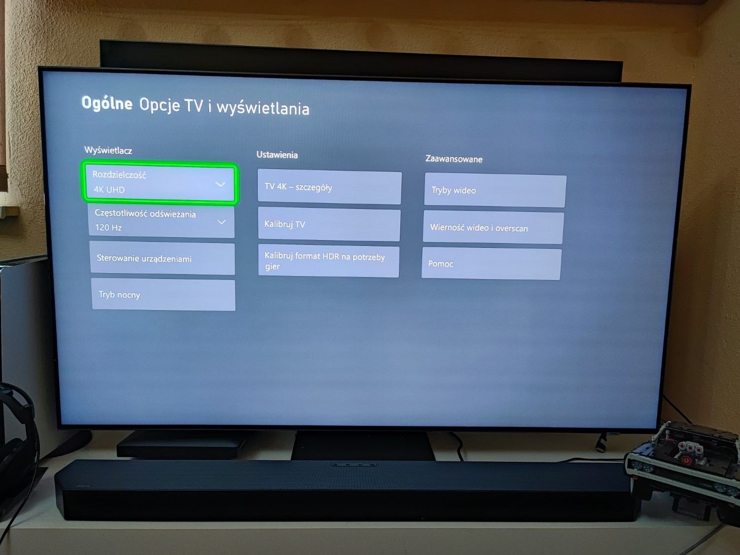 Aplikacja Xbox ma również skromne menu ustawień. Aby je wywołać, przytrzymujemy przez kilka sekund przycisk Play na pilocie. Znajdziemy tam m.in. podstawowe ustawienia kontrolerów i dźwięku przestrzennego. Jednak kluczowe są ostatnie dwie opcje: “Obraz gry” oraz “Wydajność gry”. W obrazie do wyboru mamy takie parametry jak standard, RPG, RTS, Sport oraz kl./s. Natomiast w ustawieniach wydajności możemy wybrać między małym opóźnieniem, a skalowaniem AI.