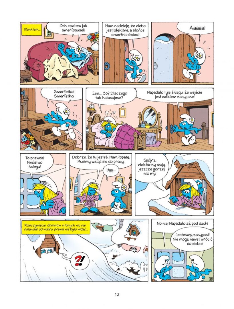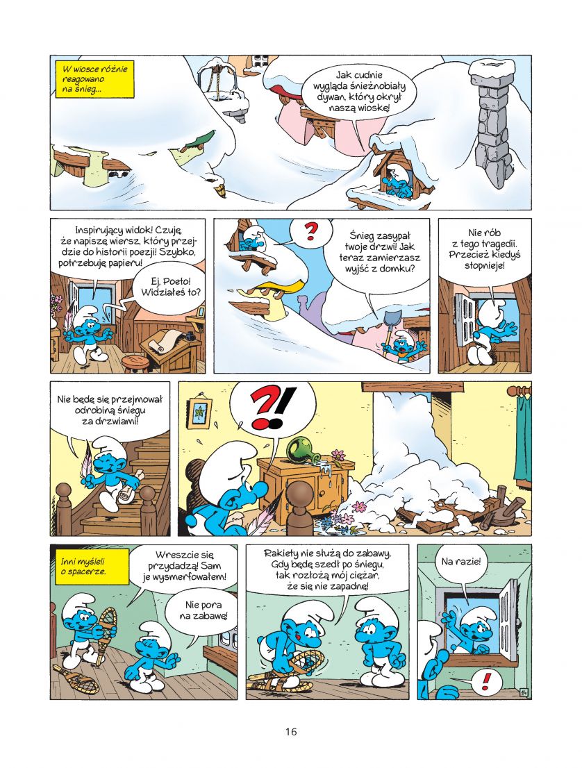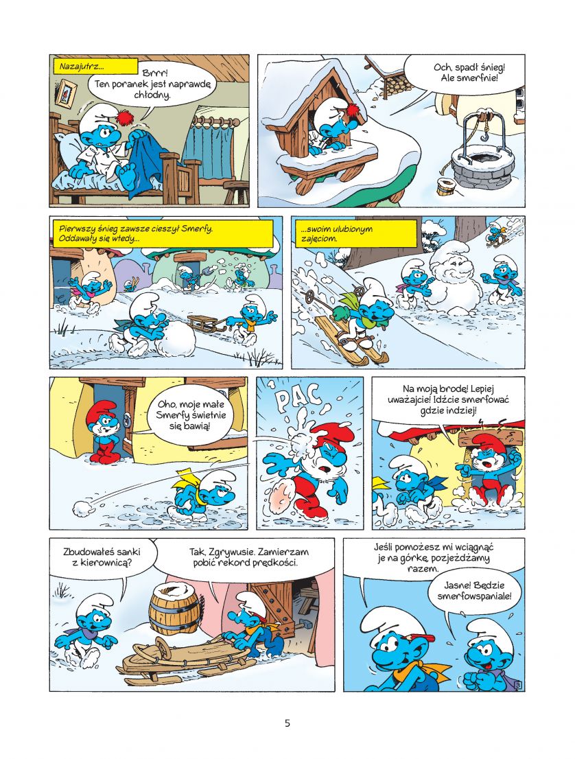 Tom 39. przygód Smerfów, niezwykłych istot, które zostały pokochane przez dzieci na całym świecie (także przez dorosłych), przenosi nas do wioski ogarniętej potężną zimą. Papa Smerf dzielnie nadzoruje wszelkie prace związane z odśnieżaniem wioski i możliwością dostania się do każdego domku. Niestety trójka niebieskich śmiałków postanowiła pójść na polanę i zjeżdżać na sankach. Na dodatek, nie zwracając przy tym uwagi na zbliżającą się kolejną śnieżycę. Nie od dziś wiadomo, że dobra zabawa może trwać w nieskończoność i nikt nie zwraca wtedy uwagi na czas. Tak też się wydarzyło. Co się stanie ze Smerfami? Gdzie znajdą schronienie? Czy wioska Smerfów przetrwa ogromne ilości śniegu?