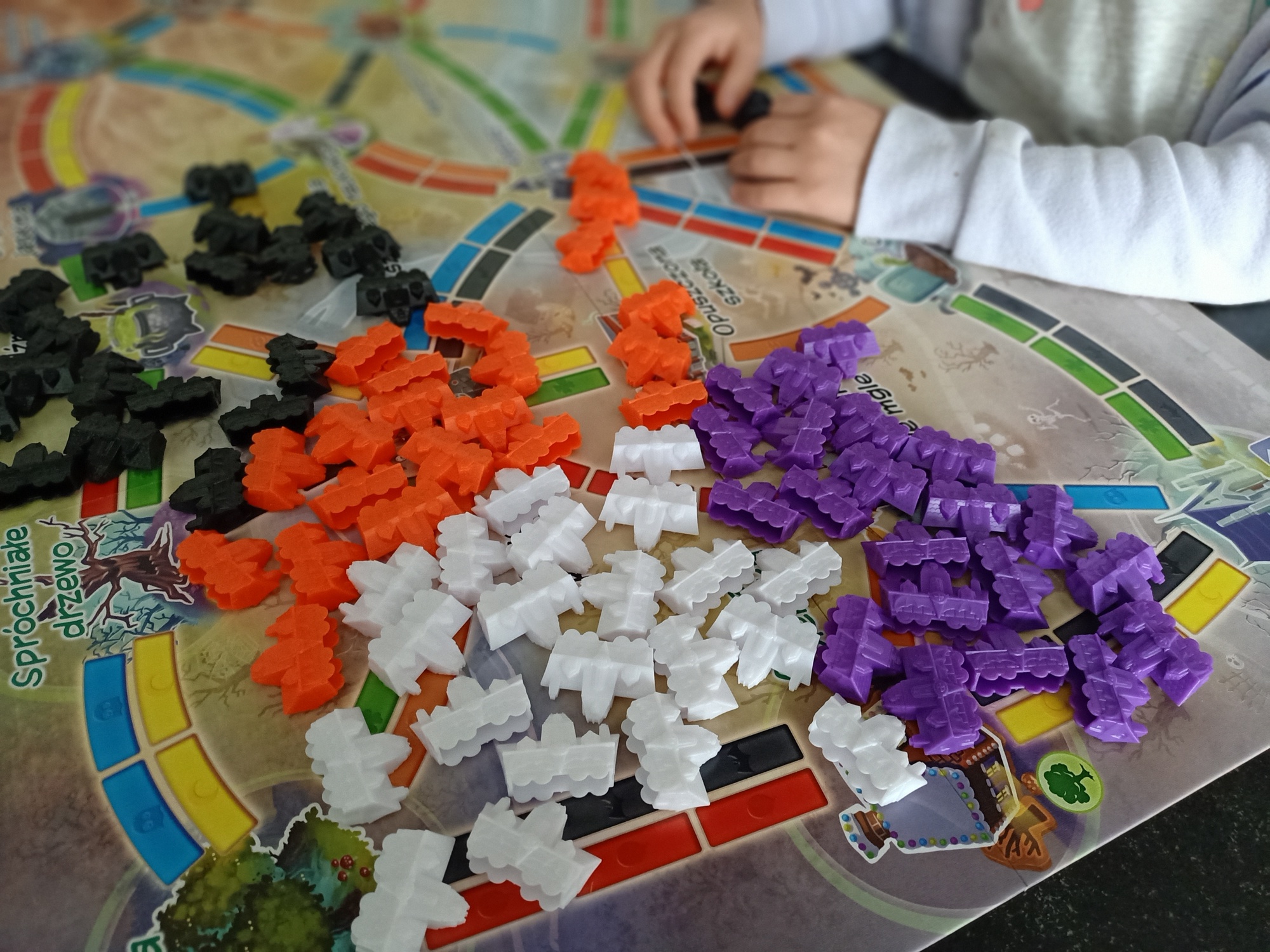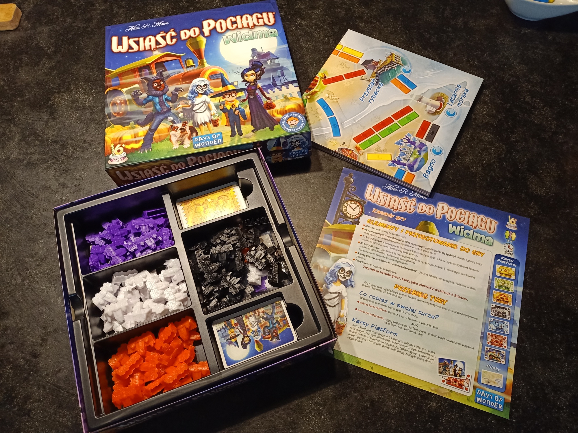 Kolejnymi wartymi wspomnienia komponentami są figurki, które stylizowane są oczywiście na “mroczne” wiktoriańskie wagoniki. Już w tym miejscu powinienem zaznaczyć, że pomimo klimatu Halloween na komponentach nie ma prawdziwe strasznych elementów. Wracając do samych wagoników, to wydają się solidne. Muszę też pochwalić zabieg, który nieczęsto widuję w wydaniach planszówek dla dzieci czy dorosłych. Pomimo że do gry potrzebne jest 20 wagoników, każdy z 4 dostępnych kolorów otrzymał 2 dodatkowe wagoniki… na wypadek gdyby część się zgubiła. Wszystko fenomenalnie mieści się w dodanej do pudełka wyprasce.