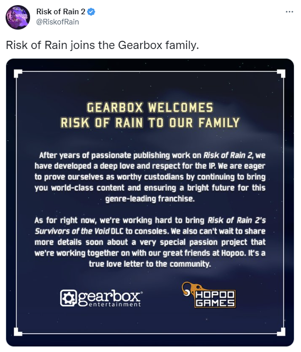 Gearbox jest też od lat wydawcą Risk of Rain 2. Jednym z pierwszych ich planów jest przeniesienie dodatku Survivors of the Void również na konsole. Na PC dostępny jest on od marca tego roku.