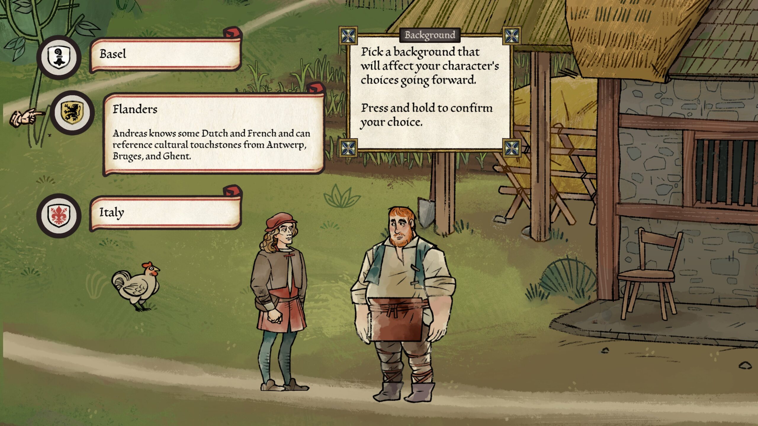 Wracając jednak do samej rozgrywki. Trochę zastanawiam się, czy to nie przygodówka/RPG, bo mamy tu element tworzenia postaci. I nie, nie w kwestii wyglądu, bo Andreas zawsze będzie wyglądał tak samo, ale jednak gra pozwala nam wybrać jego „tło”. Mamy wpływ na pochodzenie naszego artysty, jego zainteresowania oraz nauki, w których czuje się dobry. W zależności od tego, na co się zdecydujemy, będziemy mieć do wyboru różne dodatkowe opcje dialogowe, które mogą nam się później przydać (lub zaszkodzić) podczas konwersacji i interakcji z otoczeniem.