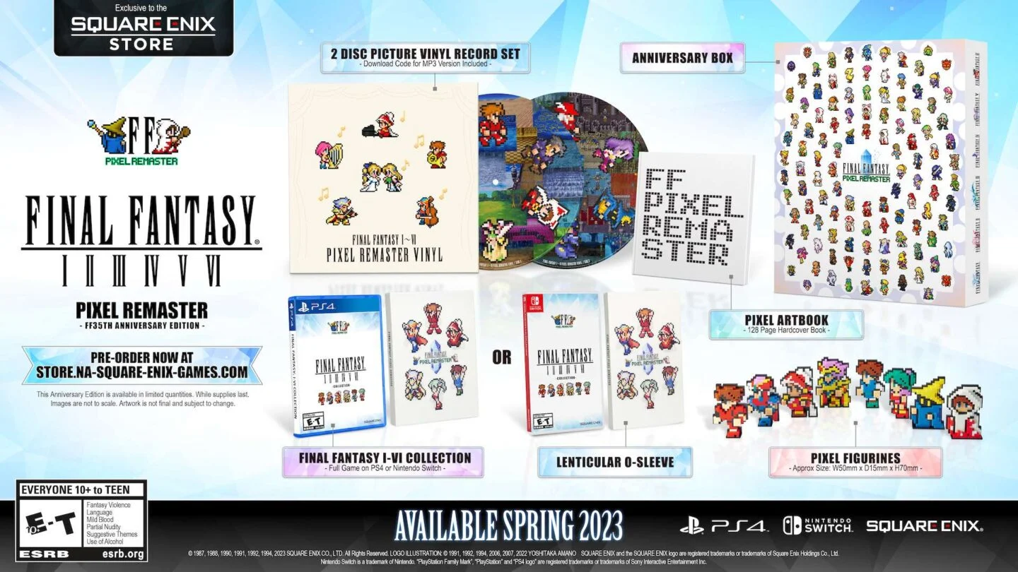 Będą to wydania Pixel Remaster, które wydane były wcześniej na iOS, Android i PC. W pakiecie znajdziemy gry Final Fantasy I, Final Fantasy II, Final Fantasy III, Final Fantasy IV, Final Fantasy V oraz Final Fantasy VI.