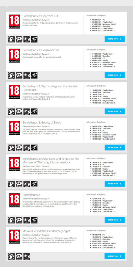 Wydany w 2019 roku looter-shooter Borderlands 3, został najprawdopodobniej oceniony dla Nintendo przez Pan European Game Information.