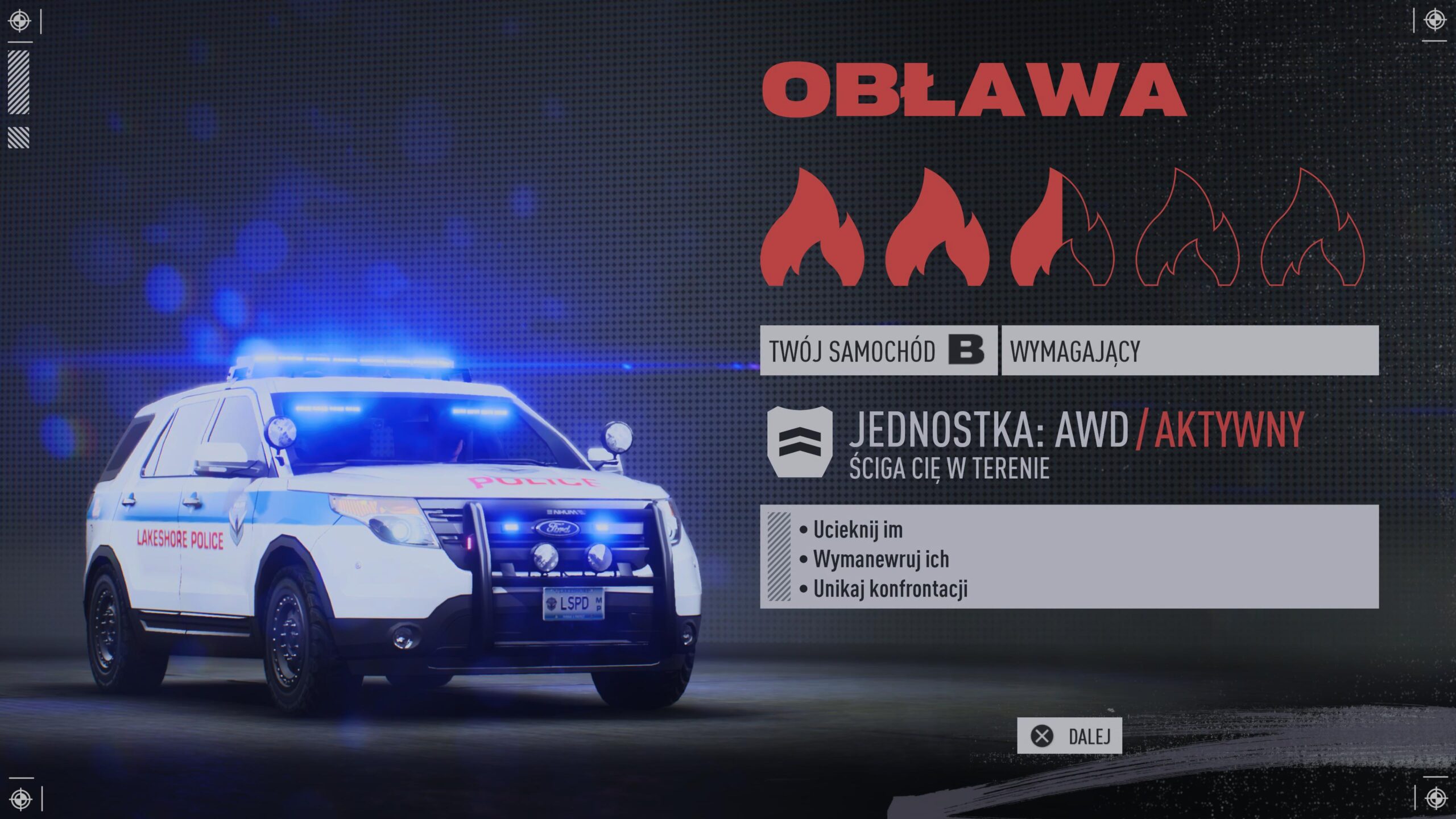 A no jeździ sobie. Gdy jesteśmy czyści jak łza, radiowóz nawet za nami nie ruszy w trakcie wyszukiwania i spokojnie możemy sobie obok nich przejeżdżać – nawet przekraczając prędkość. Im większy poziom ognia (jak to nazwałam), tym bardziej uciążliwa staje się walka z ucieczką. Nie mamy na mapie elementów, którymi możemy “zaatakować” radiowóz. Wjeżdżając w latarnię, nic się nie stanie. Na dodatek im bardziej jesteśmy poszukiwani, tym lepsze radiowozy nas ścigają. No bo, jak ja mam uciec, kiedy jeżdżę Eclipse 2G, a ściga mnie Corvetta…? Policja w Need for Speed Undound posługuje się helikopterami, tajniakami i oczywiście, kolczatkami, które już w niejednej odsłonie musieliśmy omijać.