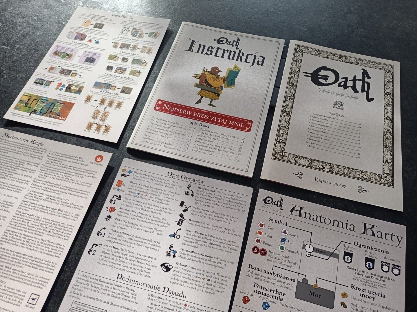 Na początku liczba materiałów do nauki może przytłoczyć. Jest to główna instrukcja, dodatkowa Księga Praw (opisująca szczegółowe zasady), plansze pomocy gracza oraz plansza Zapisu Kroniki po rozgrywce. Jeśli jesteśmy zainteresowani grą solo, przewidziano również planszę zasad do tego trybu wraz z Mapą Myśli „Mechanicznego Księcia”. Oczywiście w tym miejscy nie będę nawet próbował tłumaczyć dokładnie zasad. Chcę się jednak skupić na głównych założeniach Oath i ocenić jej przystępność. Ogólnie rzecz biorąc, mamy tu do czynienia z asymetryczną grą o władzę, gdzie zwycięzca może być tylko jeden. Jednak dróg do zwycięstwa jest bardzo wiele, a niektóre wiodą nawet przez zmianę statusu z banity na obywatela rządzonej przez kanclerza krainy…