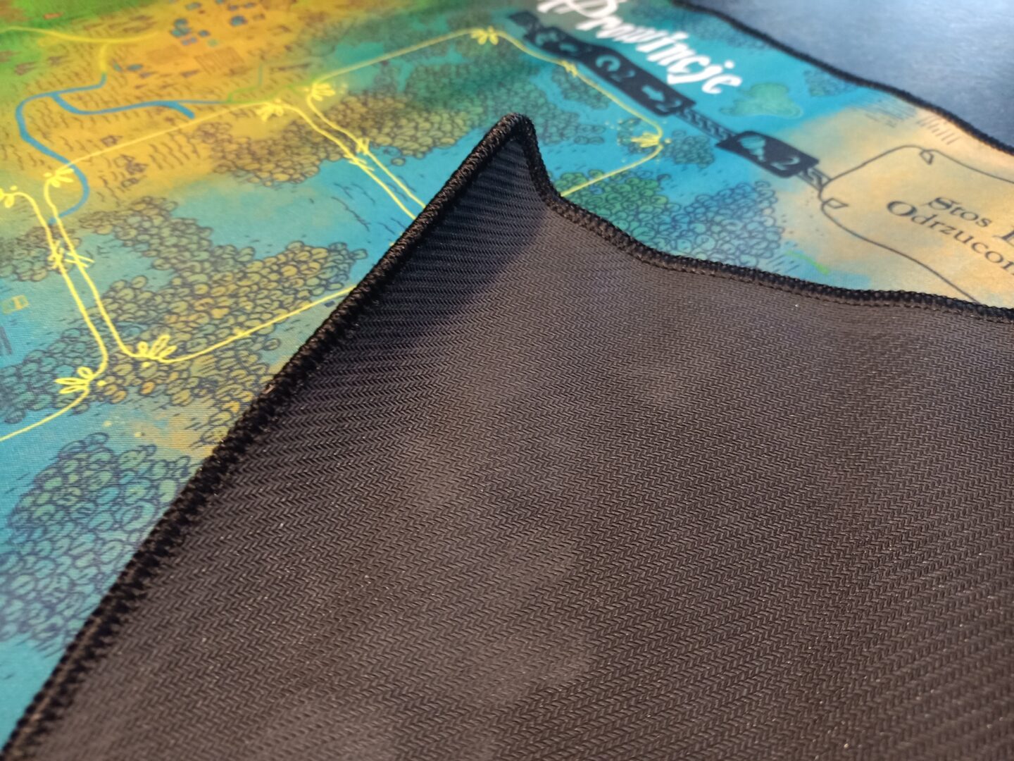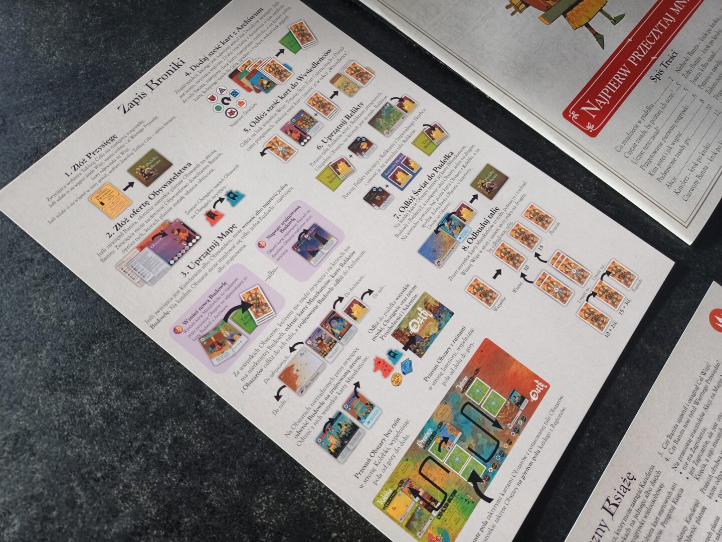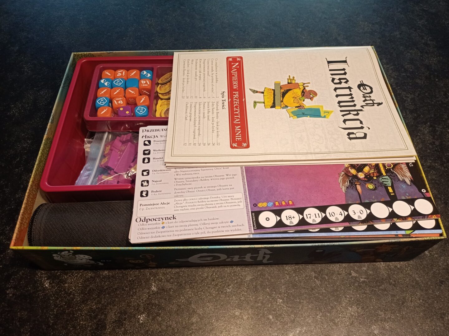 Nie sposób przemilczeć mapy, na której prowadzane będą rozgrywki. Zamiast tektury dostarczono ją w formie neoprenowej maty. Jest podgumowana i obszyta na krańcach. To pierwszy raz, kiedy widzę tak dobrze wykonaną matę do gry, a to przecież standardowa edycja Oath! Cieszy też fakt dołączenia dodatkowej wypraski, w której zmieści się 16 kości ataku i obrony oraz 1 kość testową, a także wybrane przez nas żetony (naturalnie proponuję chować tam przychylność i sekrety). Ostatnim nietypowym elementem gry jest pudełeczko do samodzielnego złożenia. Będziemy w nim przechowywać wynik ostatniej rozgrywki, co stopniowo będzie zmieniać świat gry. Chcę podkreślić i pochwalić to, że wszystko w pudle gry ma swoje miejsce. Nie potrzebujemy do tego żadnych dodatkowych organizerów poza tym, co już znajdziemy w Oath. Wydanie stoi na najwyższym poziomie.
