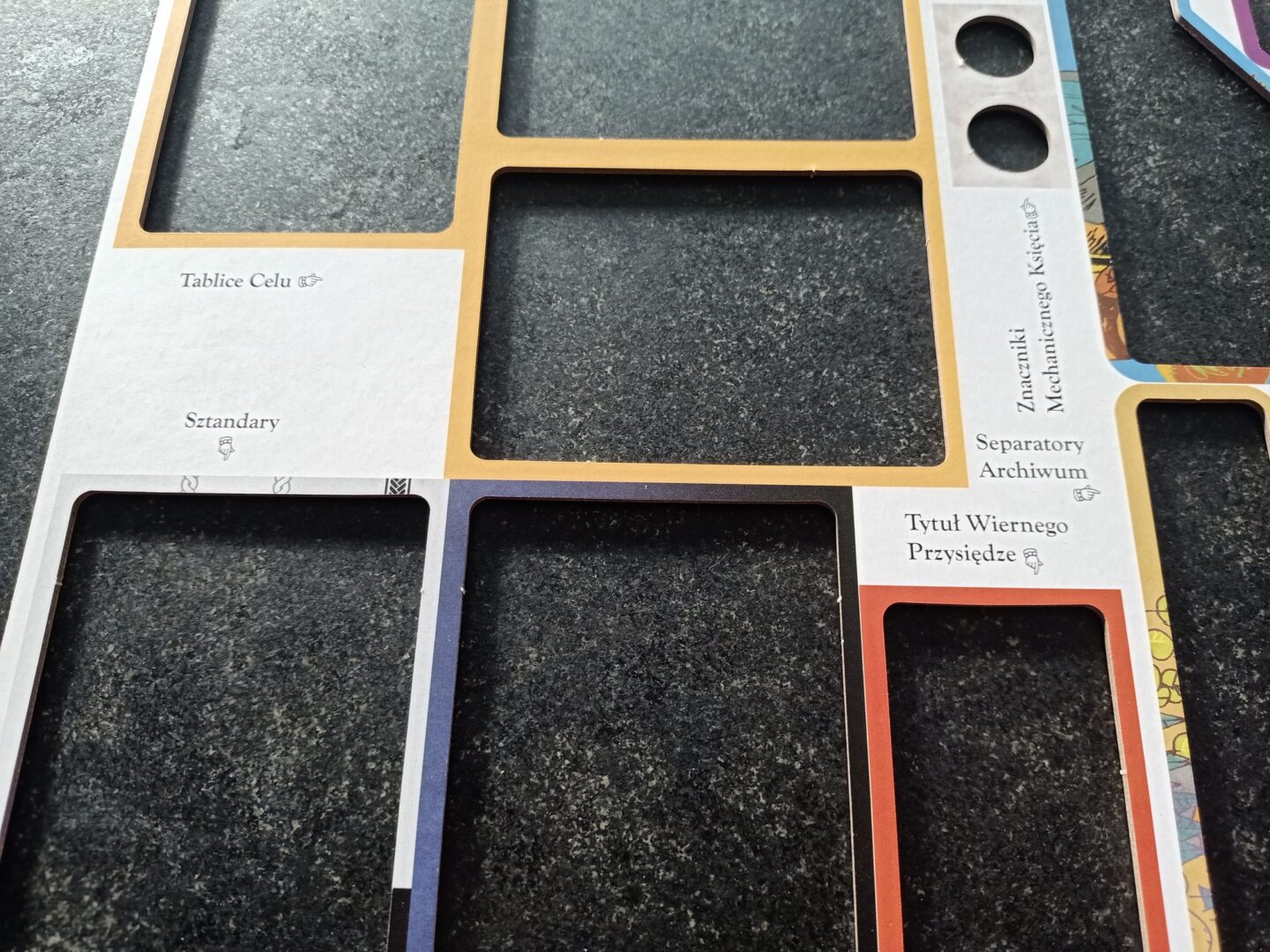 Oprócz tego w grze znajduje się 100 przyjemnych w dotyku drewnianych pionków w 6 różnych kolorach (dla kanclerza i 5 innych graczy) wraz z workami strunowymi do ich przechowywania. Z wyprasek wyjmuje się żetony przychylności (wyglądają jak monety), sekrety (księgi) oraz całą masę plansz (tablice aktywnego celu, tytuł wiernego przysiędze, sztandary, plansze graczy oraz znaczniki bandytów i automy). Trzeba docenić, że już na samych wypraskach znajdują się informacje, jakie elementy gry właśnie z nich wypychamy, co już wspiera naukę jej zasad.