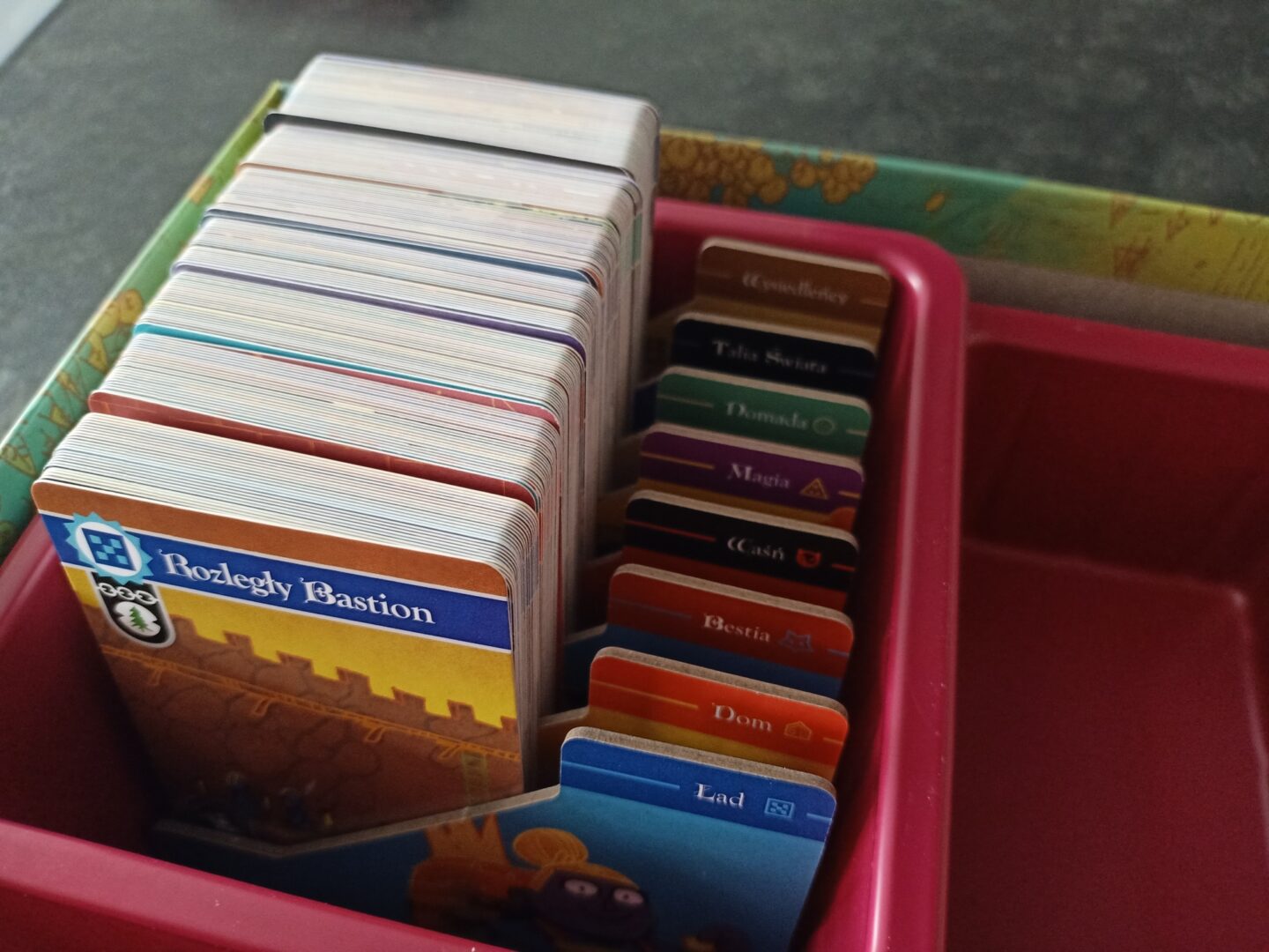 Przede wszystkim jest tu przeszło 250 kart ze wspomnianymi grafikami Kyle Ferrina. Składają się na nie 23 duże karty obszarów, standardowe karty 203 mieszkańców i 6 budowli oraz 21 mniejszych kart reliktów. Jeśli myślicie o zakoszulkowaniu gry, przygotujcie protektory 23 x 115x89mm, 209 x 57x89mm, 21x 57x57mm. Co ważne, gra pomieści się w pudełku nawet z kartami w ochronie. Do pudełka dołączono separatory, które pozwolą w przejrzysty sposób posegregować karty w specjalnej przegródce.
