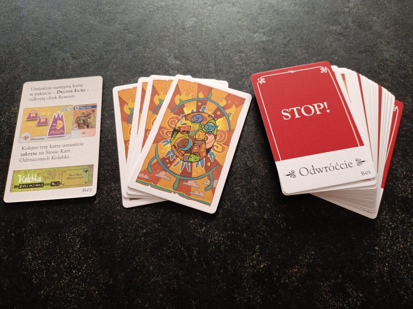 Wracając jednak do nauki, wielki napis na instrukcji skłania, żeby zacząć lekturę właśnie od niej. Po krótkim wstępie zachęca się nas do rozłożenia gry dla 4 osób. Rozpakowując talie, na osobnych kartach wewnątrz stosów znajdziemy polecenia krok po kroku, gdzie położyć dane karty. Dlaczego właśnie tak? W instrukcji znajduje się sekcja bardzo przejrzyście omawiająca przykładową pierwszą turę każdego z graczy. Oczywiście nie są to pozbawione sensu decyzje i już później możemy kontynuować rozgrywkę. W tych pierwszych ruchach opanujemy jednak podstawowe akcje, które opisałem poniżej.
