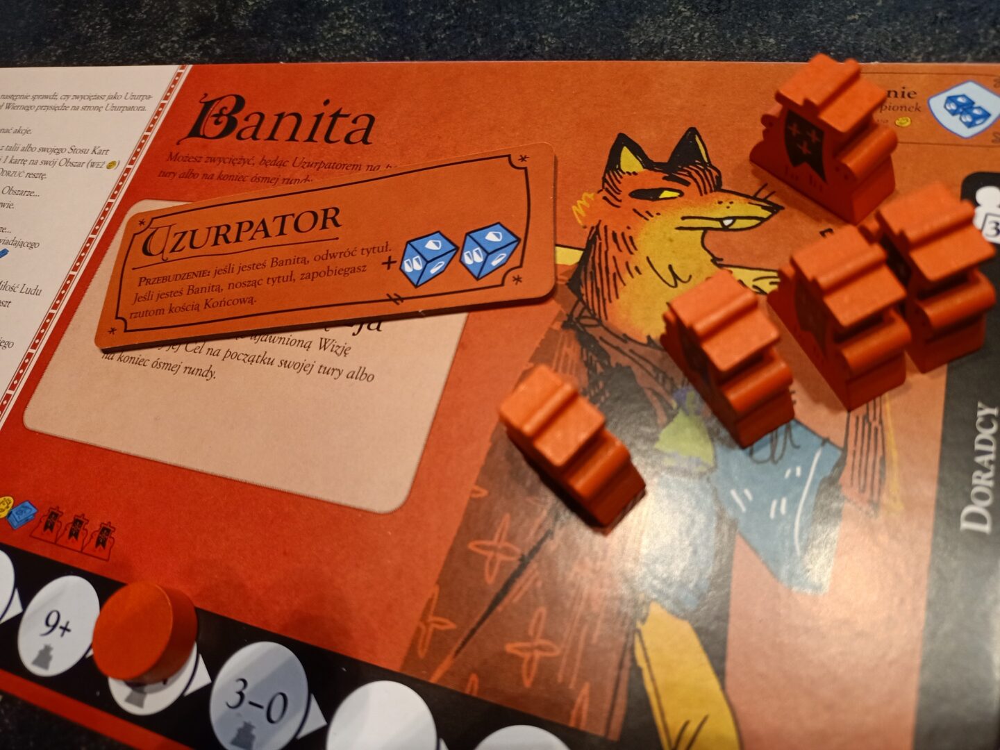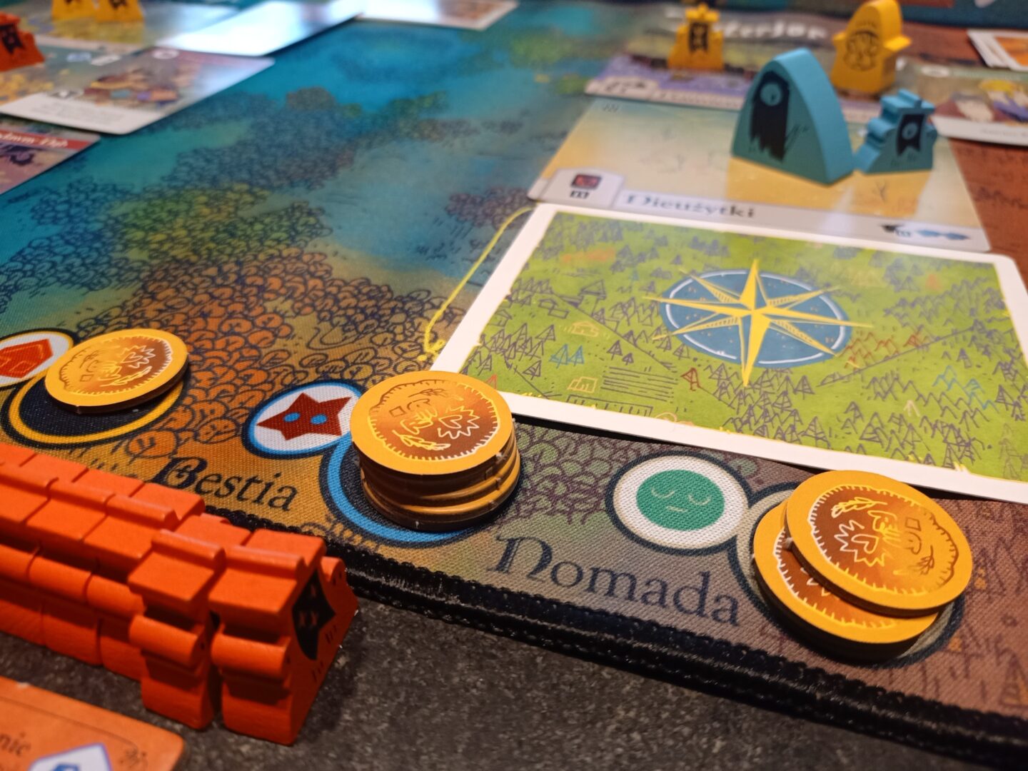 Element ten bardzo mi się spodobał, jednak nie mniej niż kolejny. W grze występują mieszkańcy i budowle odpowiadające jednej z sześciu frakcji: Waśni, Magii, Domu, Ładu, Bestii i Nomadów. Każda z nich ma swój bank z pieniędzmi (wpływami), a liczba tego zasobu w grze jest ograniczona. Handlując z mieszkańcami danej frakcji na planszy, zasilimy więc ich skarbiec. Tworzy to wrażenie żywej ekonomii podczas gry i pokazuje, którzy mieszkańcy bogacą się, a którzy biednieją podczas konfliktu o władzę.