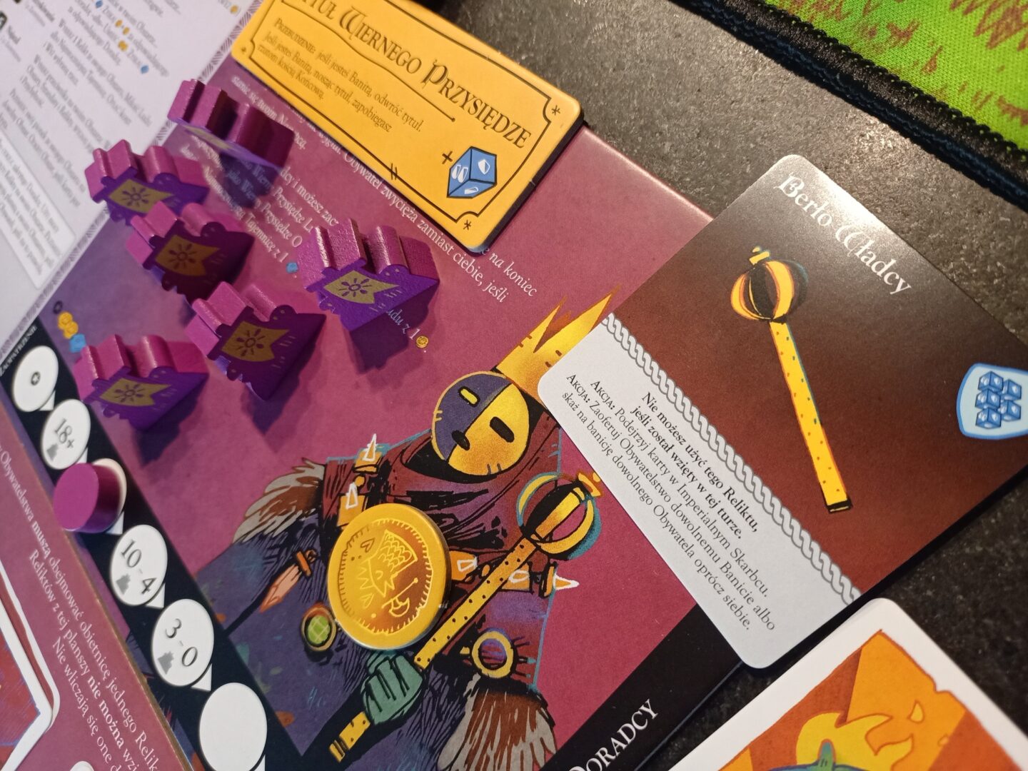 Zanim przejdę do omówienia klimatu rozgrywki, muszę wyrazić moje uznanie w kierunku samej mechaniki gry. Mamy tu elementy area control, tworzenia ręki (w ograniczonym stopniu, ale zawsze), a także konstruowania małego silniczka do zarabiania zasobów (dopóki inni gracze go nie popsują). Samo zarządzanie zasobami zasługuje jeszcze na uszczegółowienie, ponieważ możemy zbierać wpływy (pieniądze), sekrety (książki), a także odnawiać zaopatrzenie. Ten ostatni zasób wydajemy na przeprowadzenie akcji, więc jest bardzo ważny. Jednak w przypadku posiadania dużej armii, będziemy mogli odnowić mniej zaopatrzenia na koniec rundy (przejadają je nasze wojska).