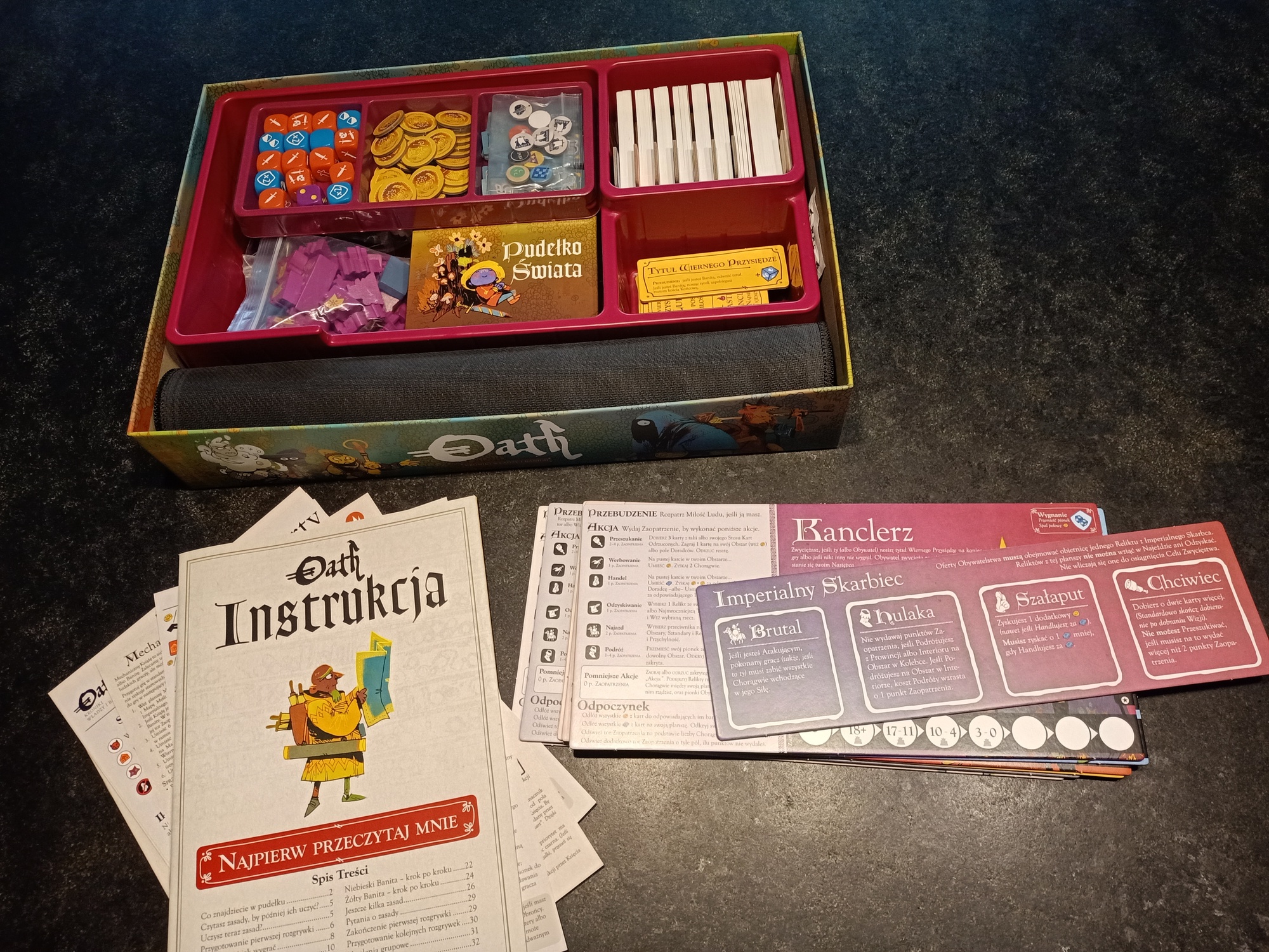 Nie sposób przemilczeć mapy, na której prowadzane będą rozgrywki. Zamiast tektury dostarczono ją w formie neoprenowej maty. Jest podgumowana i obszyta na krańcach. To pierwszy raz, kiedy widzę tak dobrze wykonaną matę do gry, a to przecież standardowa edycja Oath! Cieszy też fakt dołączenia dodatkowej wypraski, w której zmieści się 16 kości ataku i obrony oraz 1 kość testową, a także wybrane przez nas żetony (naturalnie proponuję chować tam przychylność i sekrety). Ostatnim nietypowym elementem gry jest pudełeczko do samodzielnego złożenia. Będziemy w nim przechowywać wynik ostatniej rozgrywki, co stopniowo będzie zmieniać świat gry. Chcę podkreślić i pochwalić to, że wszystko w pudle gry ma swoje miejsce. Nie potrzebujemy do tego żadnych dodatkowych organizerów poza tym, co już znajdziemy w Oath. Wydanie stoi na najwyższym poziomie.
