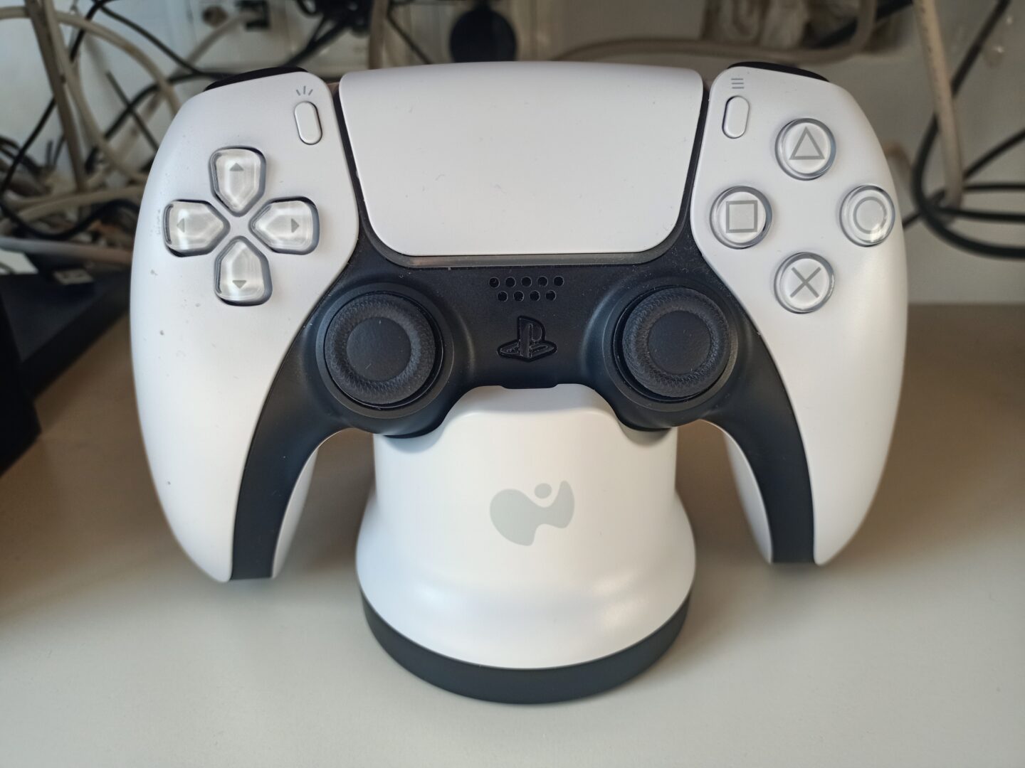 Do tej pory dok ładujący dostępny jest w trzech wariantach kolorystycznych: białym, czarnym i czerwonym. Jak możecie zobaczyć to na zdjęciach, moja testowa wersja dostarczona została w kolorze białym, co dobrze komponuje się z podstawowym kontrolerem do PS5. Stacja dokująca jest ponadto bardzo lekka, ponieważ waży około 105 gramów. Aby nie przesuwała się w trakcie odkładania czy wyjmowania z niej kontrolera, przyklejono na jej spodzie gumowe tasiemki. Zdały swój egzamin i skutecznie przeciwdziałały przesuwaniu się stacji podczas jej użytkowania. Warto jeszcze wspomnieć, w jaki sposób naładujemy kontrolery. Nasadza się je na bolce ładowarki dolną stroną. Dokładnie tą, gdzie znajdują się porty minijack w DualSense.
