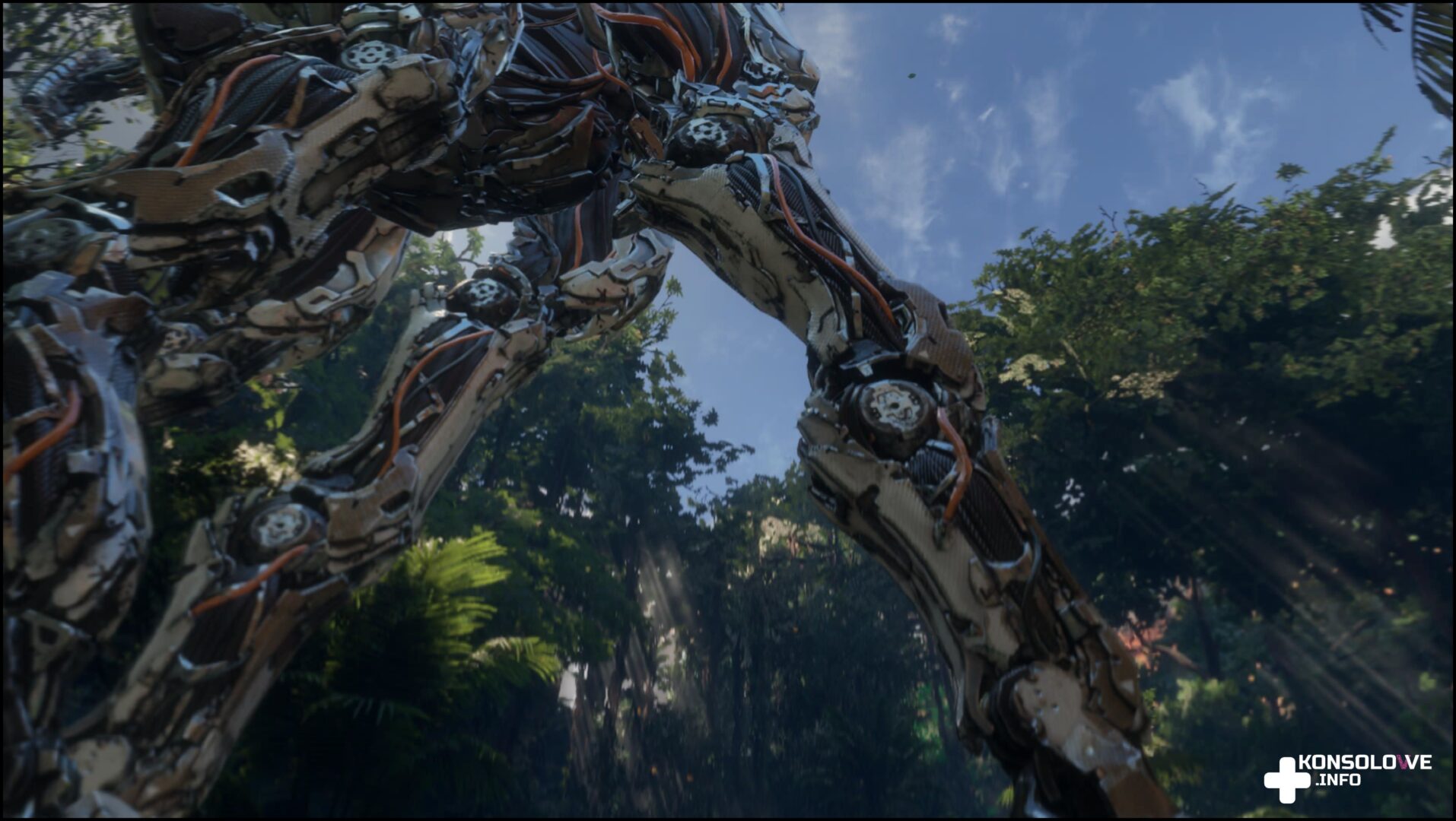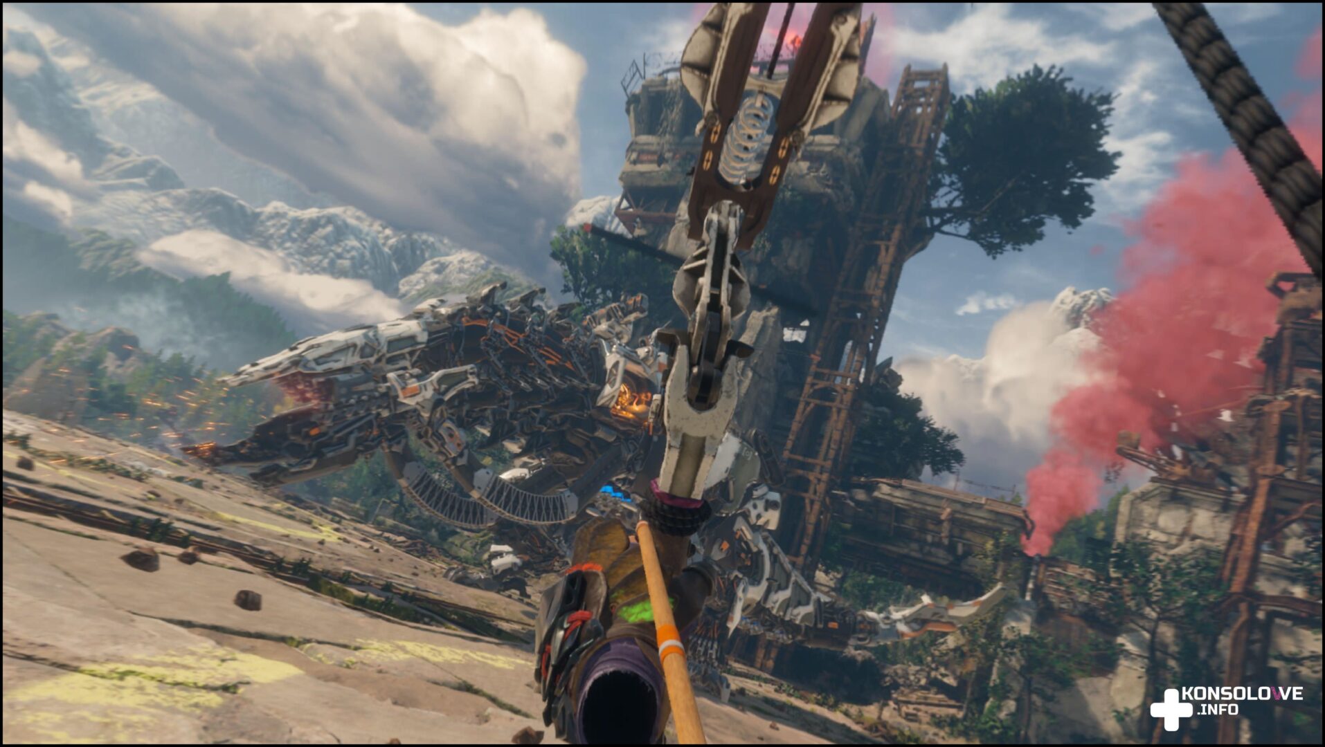 Dokonujemy tego, wyciągając łuk i odwracając dłoń z nim wierzchem do góry. Teraz wybieramy rodzaj strzały, naciskamy X i… nie, nie wytwarzamy automatycznie. Umieszczamy lotkę w odpowiednim, wyraźnie widocznym miejscu. Tak samo robimy z grotem i ewentualną ampułką. Jest to bardzo prosty proces, aczkolwiek jednocześnie niesamowicie wciągający i wpływający korzystnie na immersję. Starcia z ogromnymi maszynami (ale też przekradanie się obok Czujek) są niesamowicie intensywne, a fakt, że musimy jeszcze wykonywać uniki, czekać na moment do ataku i strzelać w nierzadko ruchomy cel tylko zachęcają do spędzania w tym świecie długich, długich godzin.