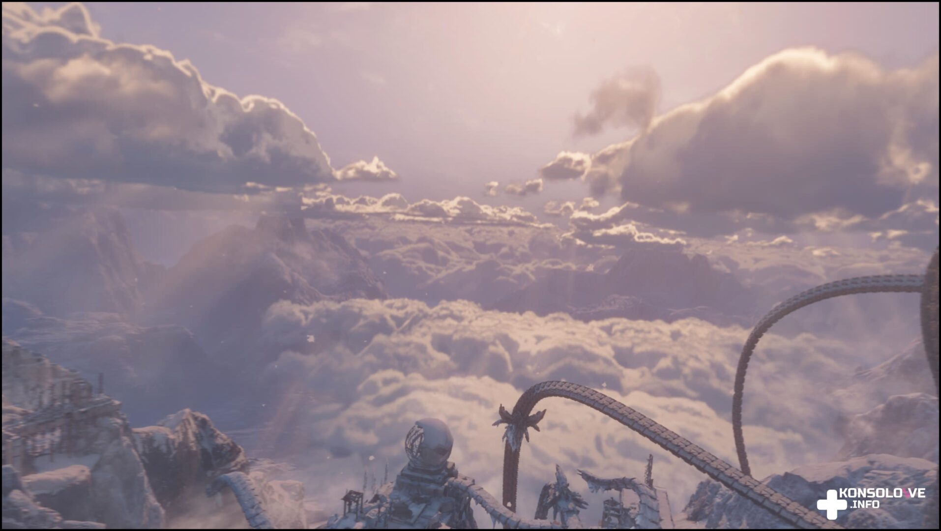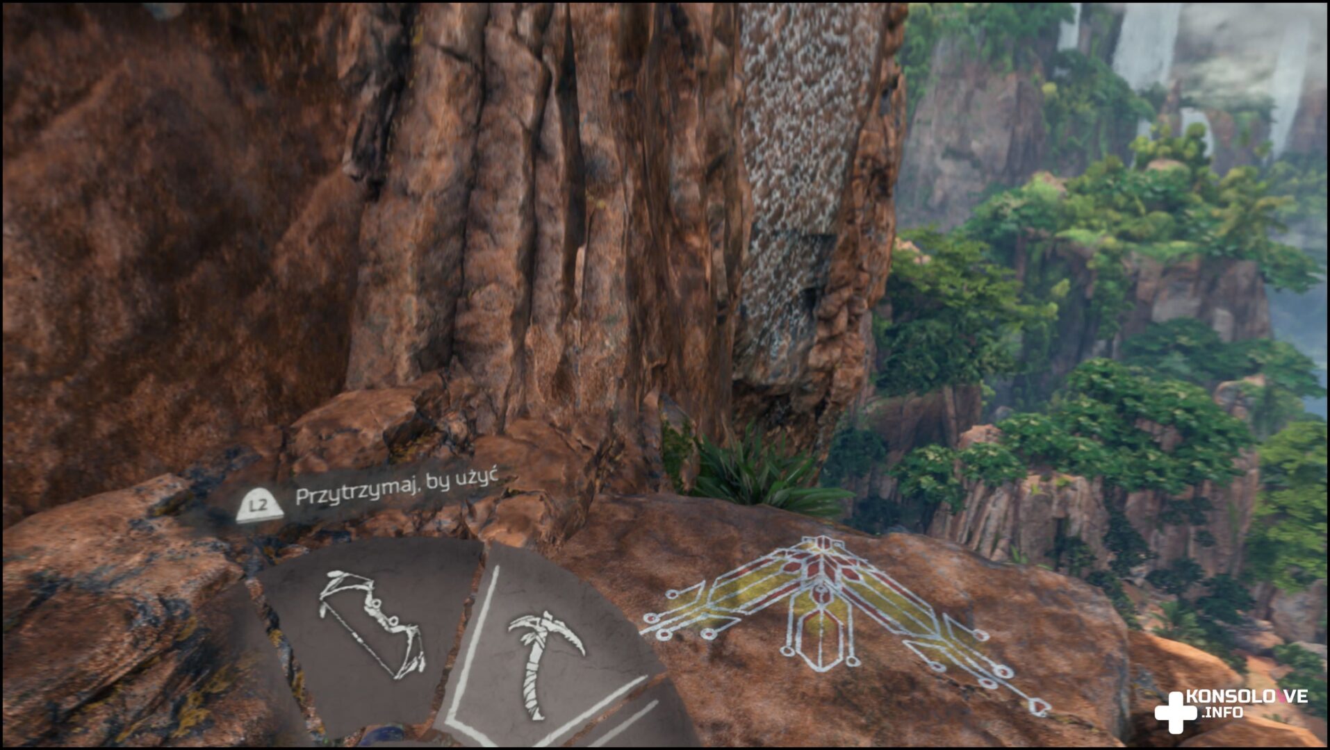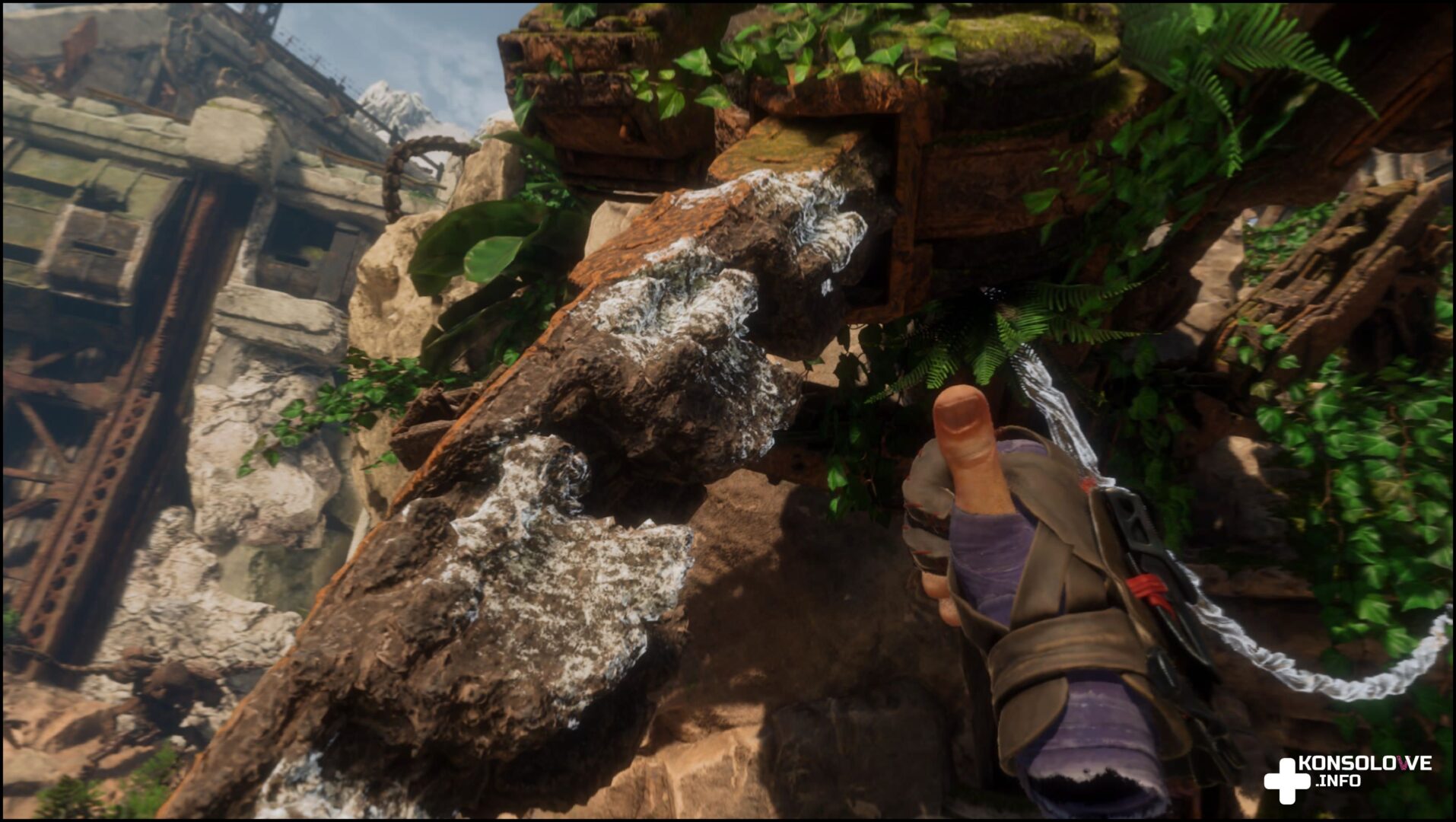 Jak widzicie na powyższym filmie, gogle i kontrolery Sense są fantastyczne i można się naprawdę zatracić w wirtualnym świecie. Rozgrywka w Horizon: Call of the Mountain polega właściwie na tym samym, co pozostałe odsłony tego cyklu. Nadal sporo czasu (w przypadku opisywanej dziś gry na pewno najwięcej) spędzimy na szukaniu drogi do celu. Jeśli zabłądzimy, możemy nacisnąć trójkąt na kontrolerze Sense. W ten sposób aktywujemy puls instynktu, który natychmiast pokaże nam najbliższy fragment drogi. Zresztą, co do eksploracji, to czego tu nie ma… Jest zjeżdżanie na linach, wspinanie się po kamiennych ścianach, przeskakiwanie sporych wyrw, wbijanie czekanów i poruszanie się w górę oraz dół płaskiej ściany, pokonywanie zardzewiałych budowli, korzystanie z wciągarki do przedostania się w pozornie zbyt odległe miejsca.