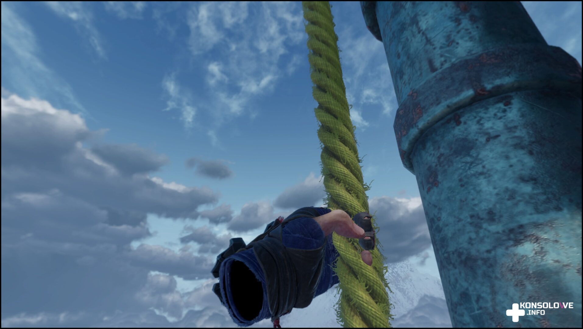 Możemy też ścierać szron z twarzy, przecierając przed goglami dłońmi. Nie brakuje też wspinaczki i szukania miejsca do chwycenia, wbijania czekanów, czy nawet trzymania się jakiejś dziury palcem. Brzmi to może dość dziwacznie, aczkolwiek zaręczam, że w toku rozgrywki nie będziecie na to zwracać uwagi. Będziecie za to zachwyceni sposobem oddania wspinaczki i nie tylko – więcej dowiecie się oczywiście z kolejnej części niniejszej recenzji.