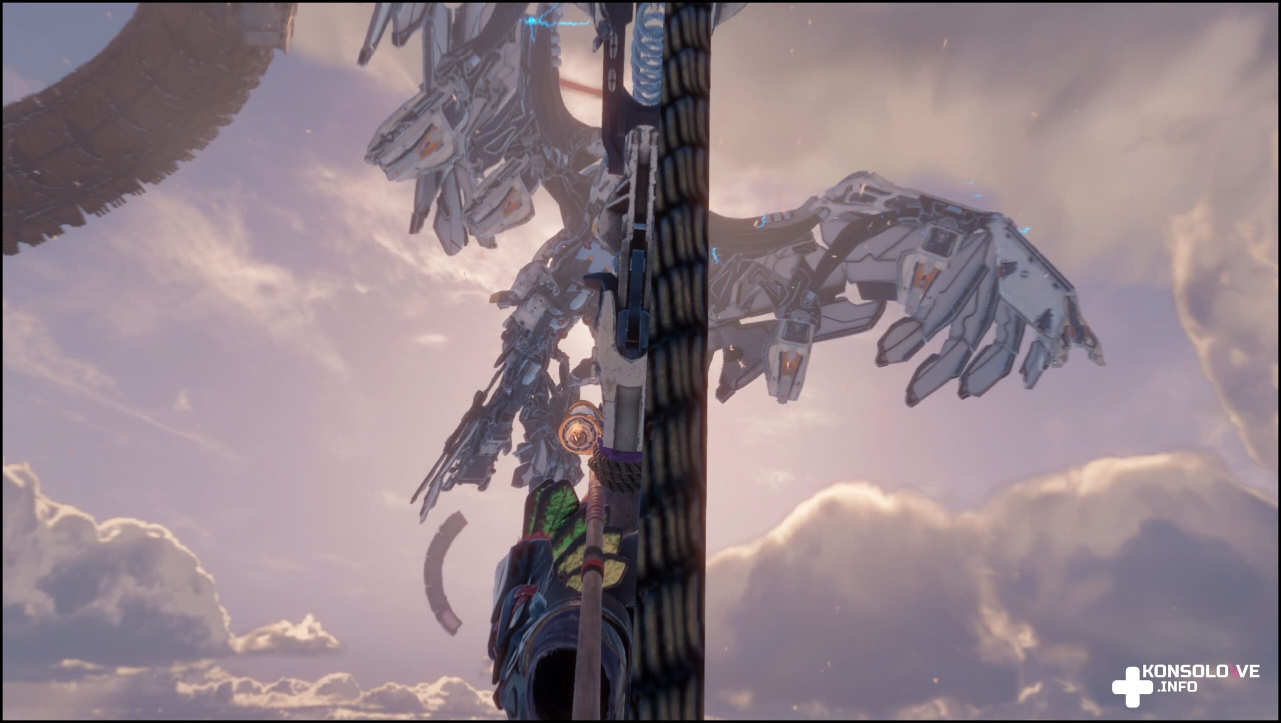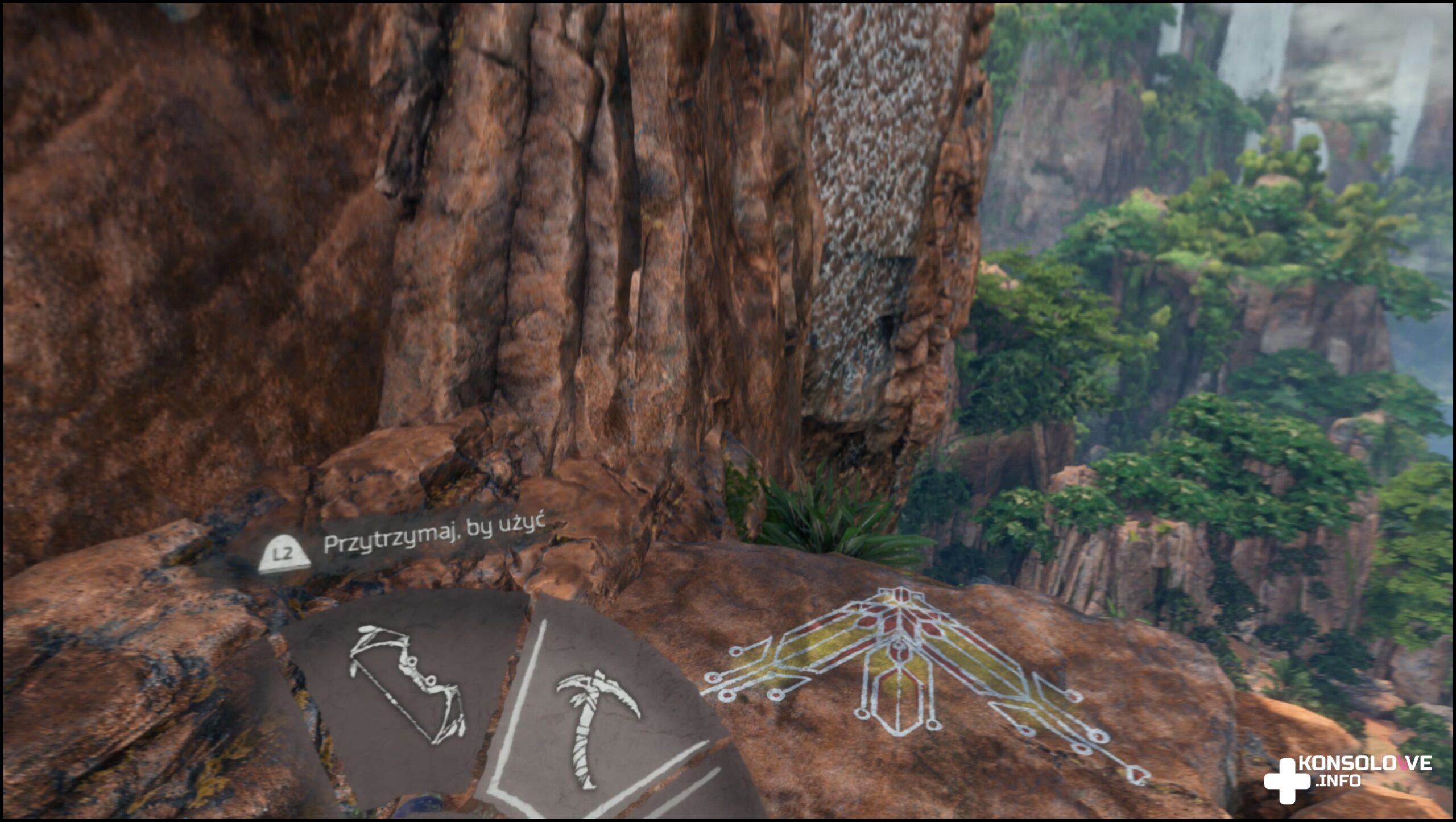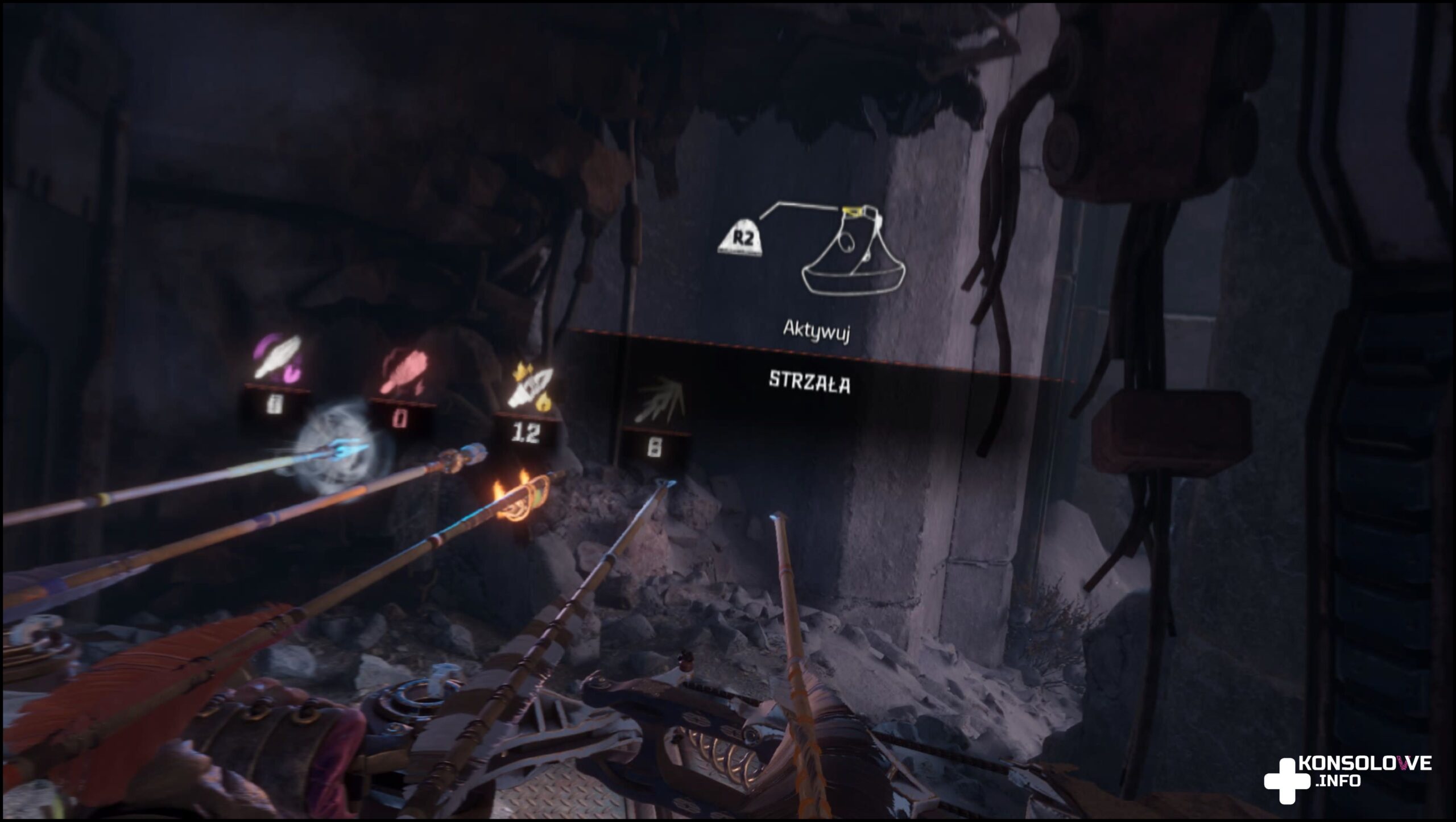 Dokonujemy tego, wyciągając łuk i odwracając dłoń z nim wierzchem do góry. Teraz wybieramy rodzaj strzały, naciskamy X i… nie, nie wytwarzamy automatycznie. Umieszczamy lotkę w odpowiednim, wyraźnie widocznym miejscu. Tak samo robimy z grotem i ewentualną ampułką. Jest to bardzo prosty proces, aczkolwiek jednocześnie niesamowicie wciągający i wpływający korzystnie na immersję. Starcia z ogromnymi maszynami (ale też przekradanie się obok Czujek) są niesamowicie intensywne, a fakt, że musimy jeszcze wykonywać uniki, czekać na moment do ataku i strzelać w nierzadko ruchomy cel tylko zachęcają do spędzania w tym świecie długich, długich godzin.