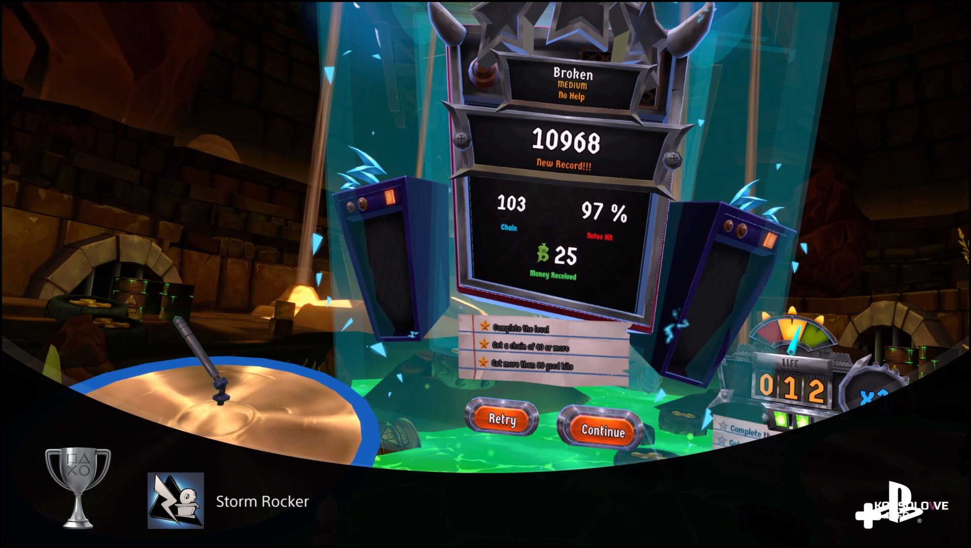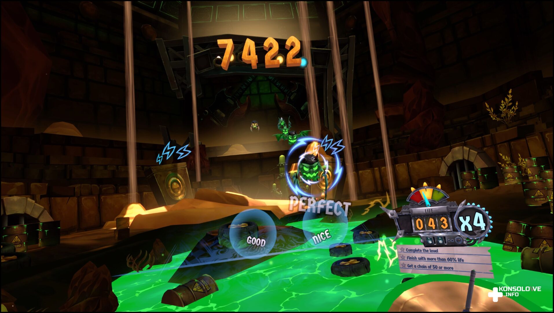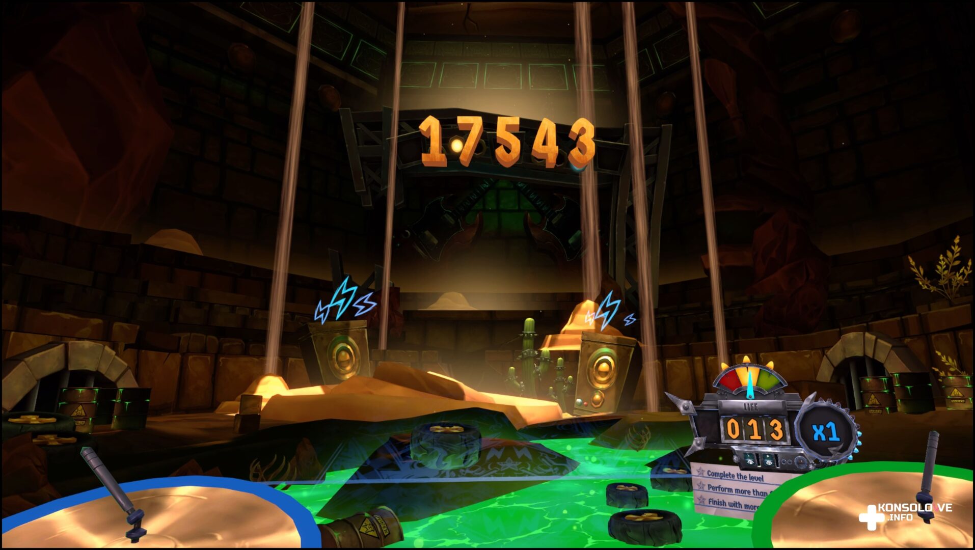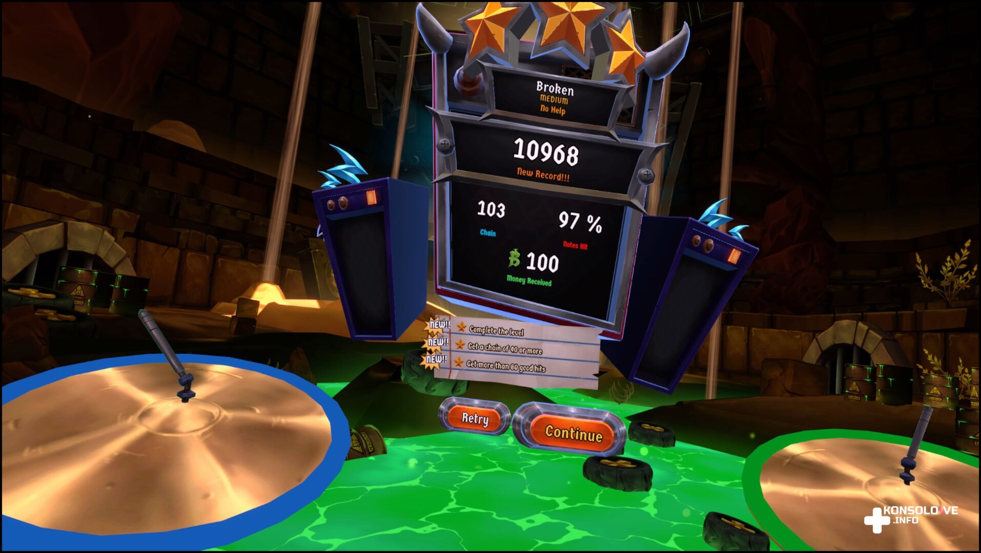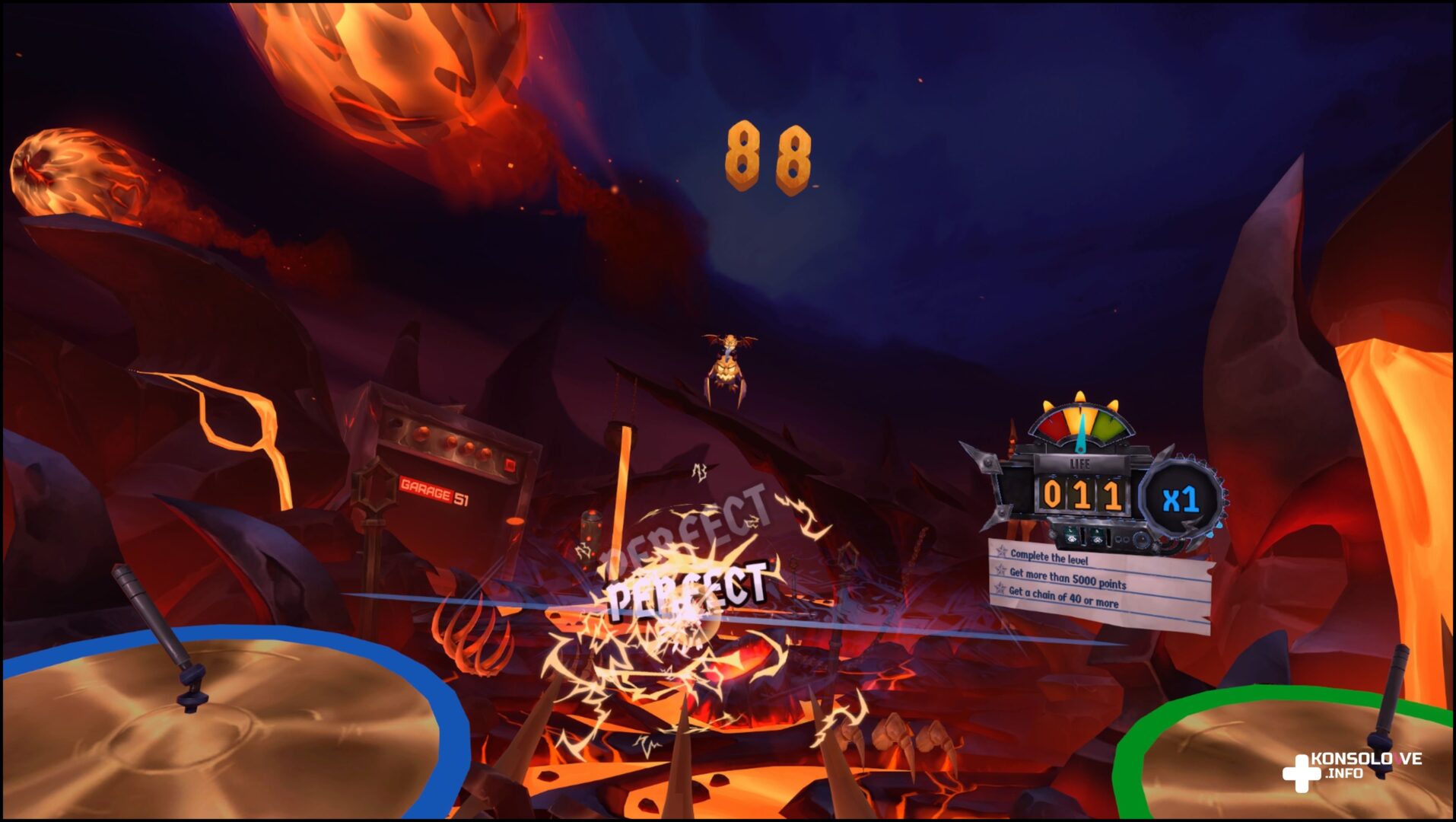 Ja jestem zachwycony tym, co dostałem i bez wątpienia niejednokrotnie będę wracał do dzieła studia Garage51. Spisali się oni na medal i mogą być dumni ze swojej produkcji. Jest niesamowicie dobra. Brawo! Jest tu co robić nawet po przejściu kampanii. Znajdziemy tryb wyzwań oraz opcjonalne cele do wykonania. Niektóre z nich polegają na osiągnięciu zadanej serii trafień, inne na zdobyciu określonej ilości punktów, jeszcze inne na odpowiednim uderzaniu w perkusję. Spełniania tych celów zapewnia nam gotówkę, a tę możemy przeznaczać na alternatywne wyglądy pałek, rękawic czy perkusji, a nawet na kolejne utwory do rozgrywania. Nie powinniście narzekać na nudę, zakładając gogle i przenosząc się do Drums Rock.