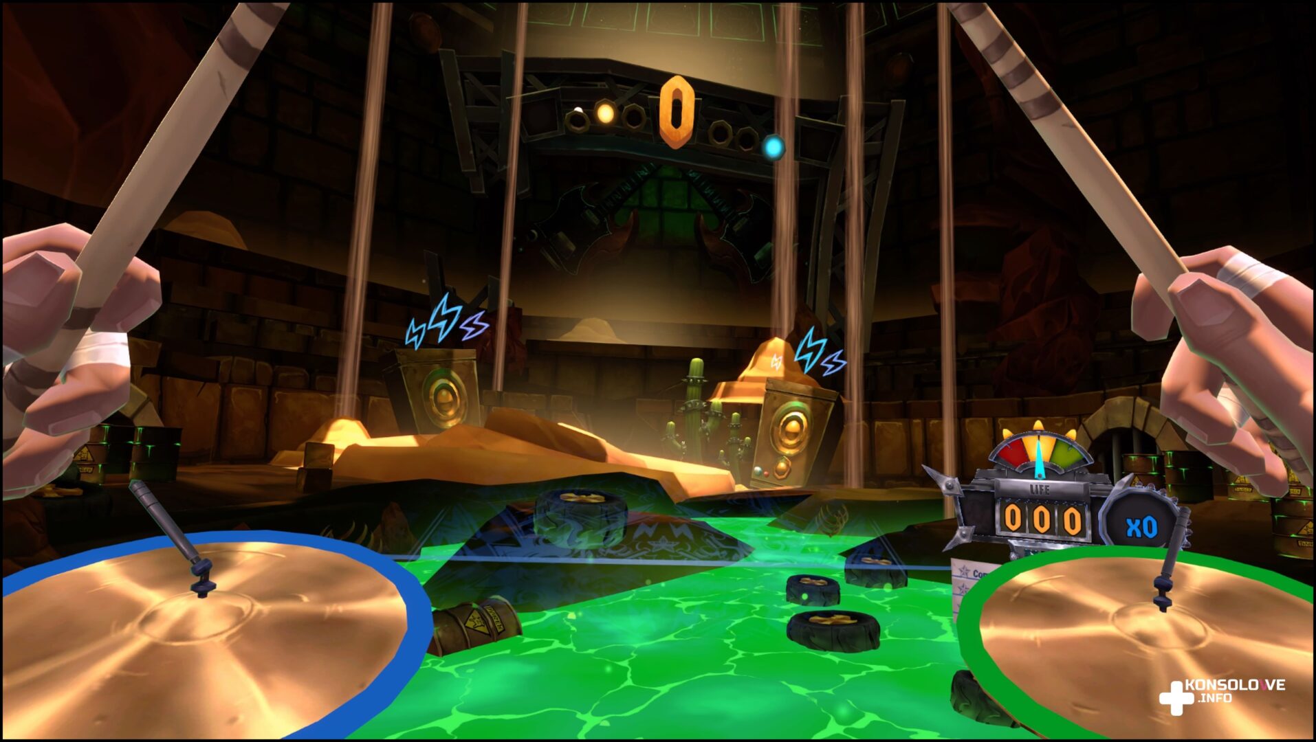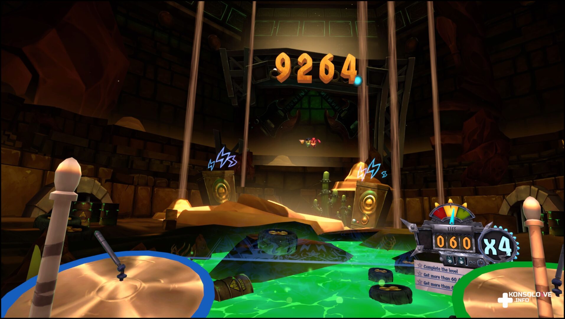 Mamy oto bowiem 6 talerzy o różnych kolorach. Odpowiadają one barwom demonów, które mamy zwalczyć. Uderzamy więc w odpowiednim momencie w talerz, a demon ginie. Im bliżej stałej linii uderzymy (możemy ją wyłączyć w menu ustawień), tym większy otrzymamy wynik punktowy. Niekiedy musimy uderzyć w dwa „gary” jednocześnie lub parokrotnie. Jest to jasno zaznaczone i bez wątpienia nie będziecie mieli problemu z rozeznaniem się, co kiedy jest od nas wymagane. Warto zaznaczyć, że możemy ustawić wysokość perkusji oraz umiejscowienie dwóch talerzy – tak, aby zawsze idealnie w nie trafiać. Rozgrywka oferuje 3 poziomy trudności. Odznaczają się one oczywiście liczbą demonów, jakie musimy pokonać oraz stopniem skomplikowania układów stworów. Ja zaczynałem na łatwym poziomie, ale wkrótce potem dobrze poczułem się na średnim. Natomiast trudny nadal jest dla mnie niemałym wyzwaniem, ale może dla Was będzie jak znalazł? Zaznaczę jeszcze, że nigdy nie miałem kontaktu z prawdziwą perkusją.