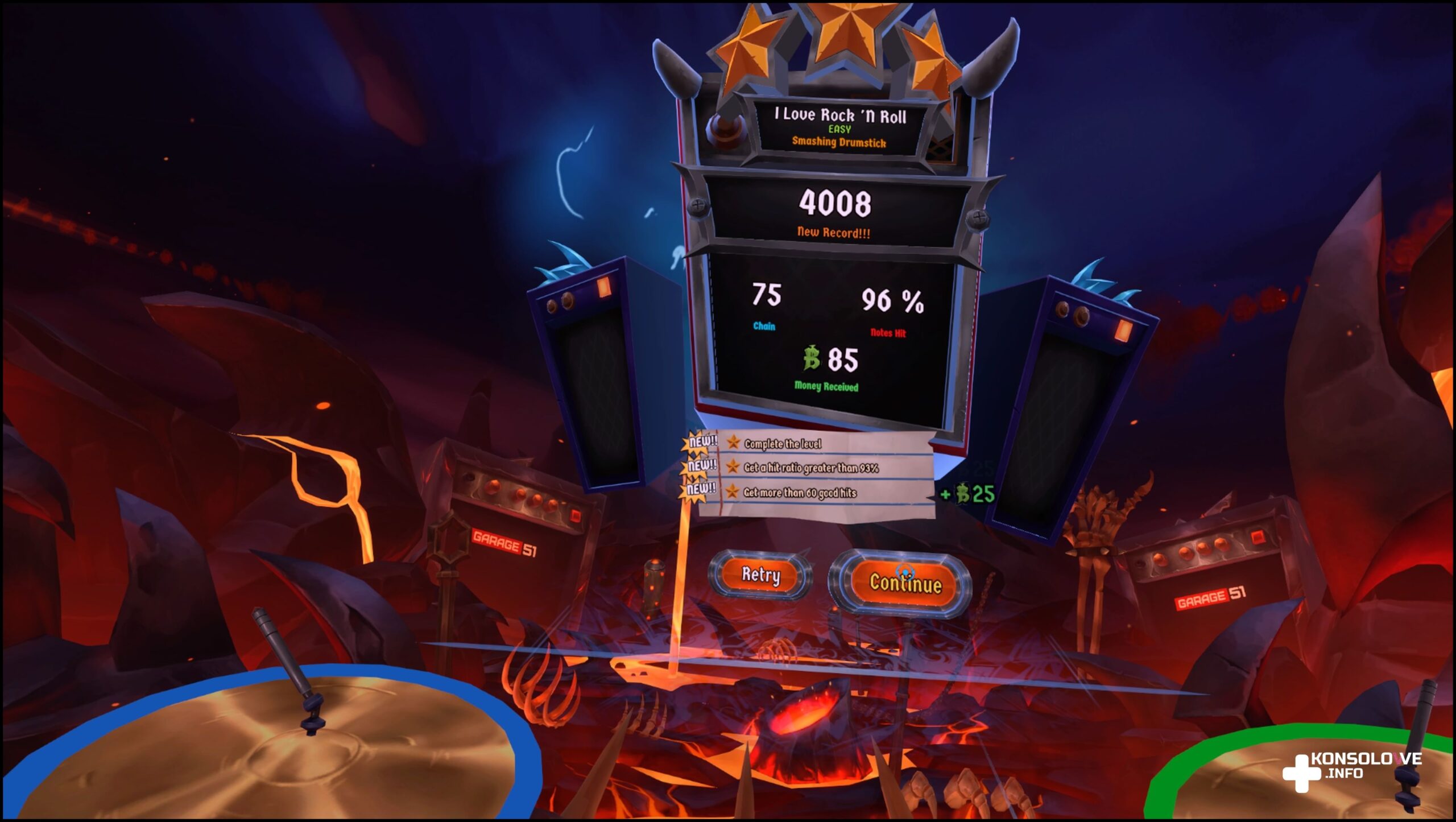 Ja jestem zachwycony tym, co dostałem i bez wątpienia niejednokrotnie będę wracał do dzieła studia Garage51. Spisali się oni na medal i mogą być dumni ze swojej produkcji. Jest niesamowicie dobra. Brawo! Jest tu co robić nawet po przejściu kampanii. Znajdziemy tryb wyzwań oraz opcjonalne cele do wykonania. Niektóre z nich polegają na osiągnięciu zadanej serii trafień, inne na zdobyciu określonej ilości punktów, jeszcze inne na odpowiednim uderzaniu w perkusję. Spełniania tych celów zapewnia nam gotówkę, a tę możemy przeznaczać na alternatywne wyglądy pałek, rękawic czy perkusji, a nawet na kolejne utwory do rozgrywania. Nie powinniście narzekać na nudę, zakładając gogle i przenosząc się do Drums Rock.
