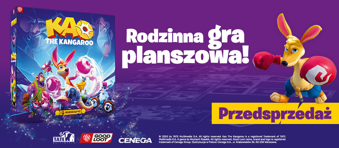Good Loot z przyjemnością informuje, że ruszyła przedsprzedaż ekscytującej, familijnej gry planszowej inspirowanej grą wideo – Kangurek Kao od Tate Multimedia. Kultowa gra wideo z 2000 roku ze skocznym Kangurkiem Kao w roli głównej osiągnęła niebywały sukces w Polsce i na świecie. Fani doczekali się nowej odsłony gry w maju ubiegłego roku (recenzję tej części znajdziecie tutaj). Teraz na rynek wskakuje gra planszowa, której twórcą jest Wojciech Rzadek – gracz i game designer, ekspert od gier planszowych, fabularnych, strategicznych, ekonomicznych i logicznych.