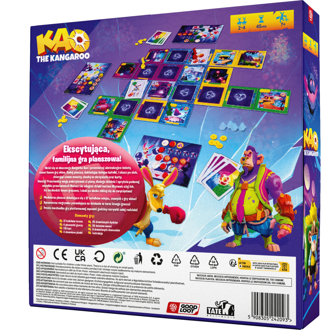 Wciel się w skocznego Kangurka Kao i przemierzaj abstrakcyjne światy, znane fanom gry video. Buduj planszę, dokładając kolejne kafelki, i skacz po nich, zbierając cenne monety, skarby w skrzyniach oraz karty. Uważaj! Przeciwnicy mogą pokrzyżować ci plany, dlatego dzielnie i sprytnie pokonuj wszelkie przeciwności! Możesz się odegrać dzięki kartom Wyzwań: użyj ich, by zaszkodzić innym graczom, i skok po skoku zbliżaj się do zwycięstwa!