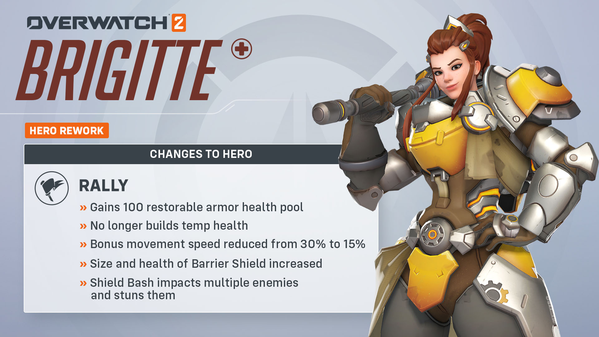 Następnie zajmiemy się superzdolnością Brigitte – Natchnieniem. Chcemy, aby bohaterka była bardziej angażująca i silniejsza, gdy używa superzdolności. Brigitte zyskuje teraz stałą ilość odzyskiwanego pancerza i zasila tarczę, zwiększając jej rozmiar i wytrzymałość. Otrzymuje także możliwość ogłuszania. Gdy usłyszycie jej okrzyk bojowy, przygotujcie się na dzikie starcie.