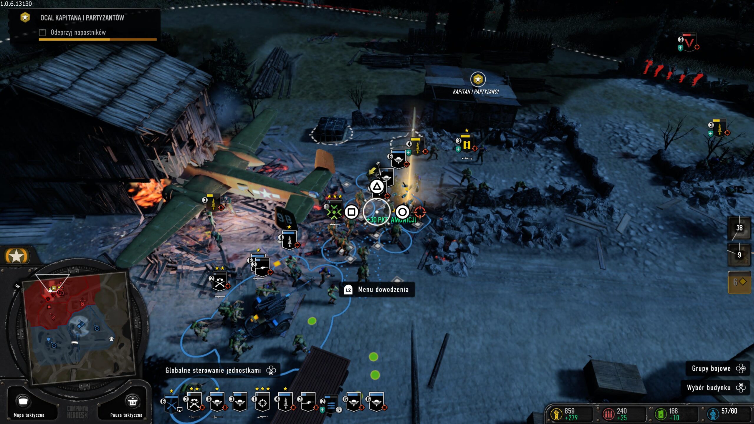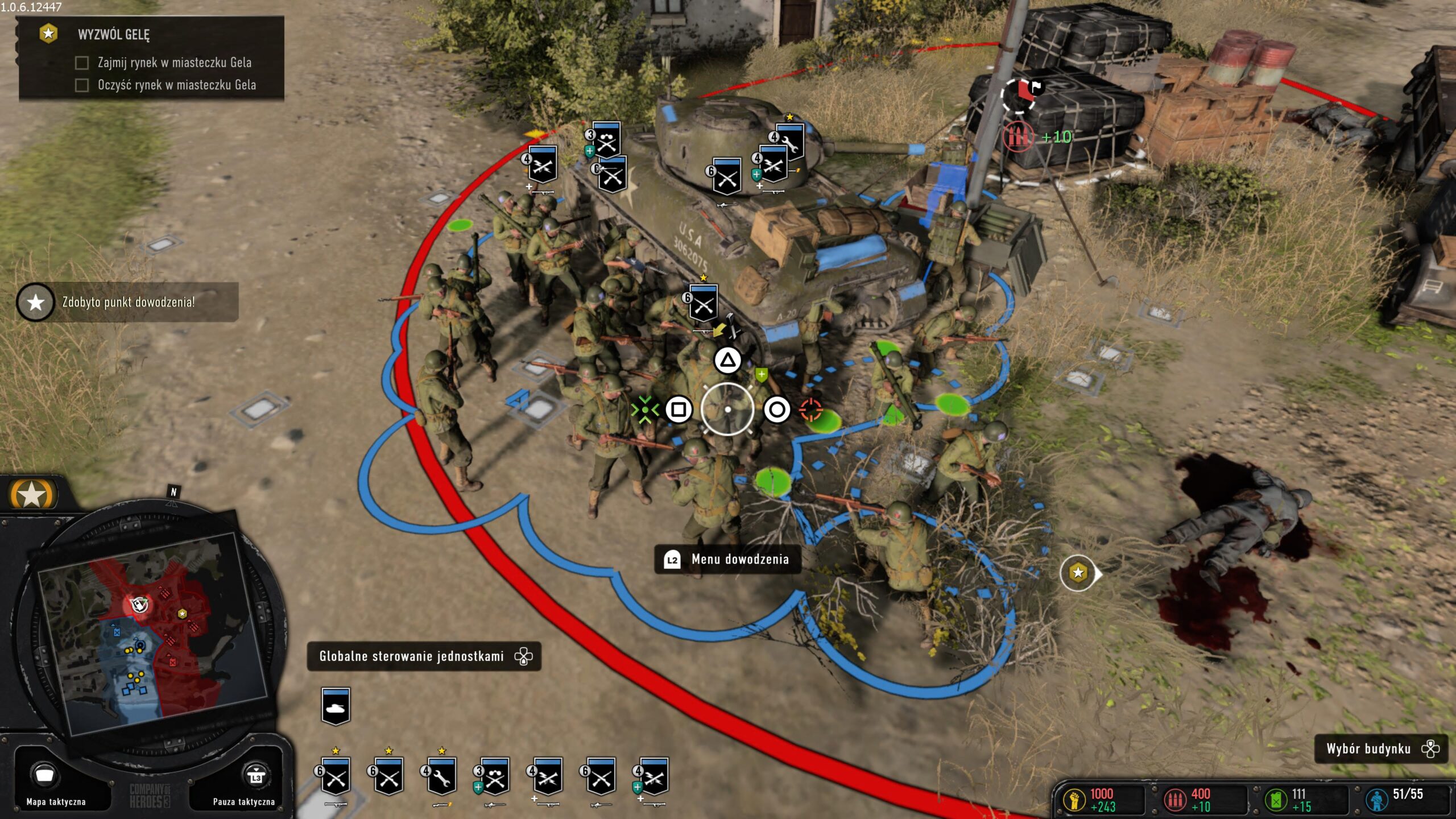 Zapytacie pewnie, jak sprawnie zarządzać już odziałem złożonym z kilku różnych jednostek? Aby zaznaczyć wszystkie jednostki tego samego rodzaju, po prostu klikamy na nią szybko dwa razy X. Możemy też przytrzymać X – wtedy od kursora do górnej i dolej krawędzi ekranu zacznie tworzyć się niebieski kwadrat. Wszystkie jednostki, które trafią do jego pola, zostaną zaznaczone i możemy wydać im wspólny rozkaz. Natomiast do szybkiego wybierania konkretnej jednostki z całej grupy służy dolny DPad. Klikamy go i teraz lewo/prawo możemy w dolnym rzędzie szybko wybrać konkretną jednostkę piechoty lub pojazd. Lewy i prawy DPad służą do wezwania grupy bojowej typu nalot oraz wykorzystania zdolności naszego dowódcy. Konkretne zdolności również wybieramy z menu kołowego.