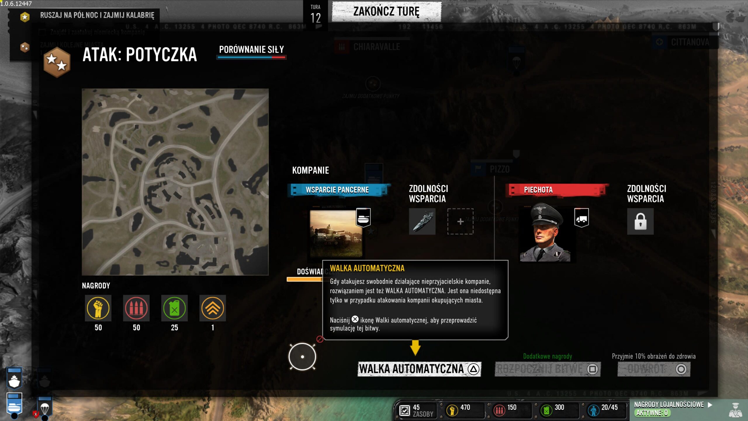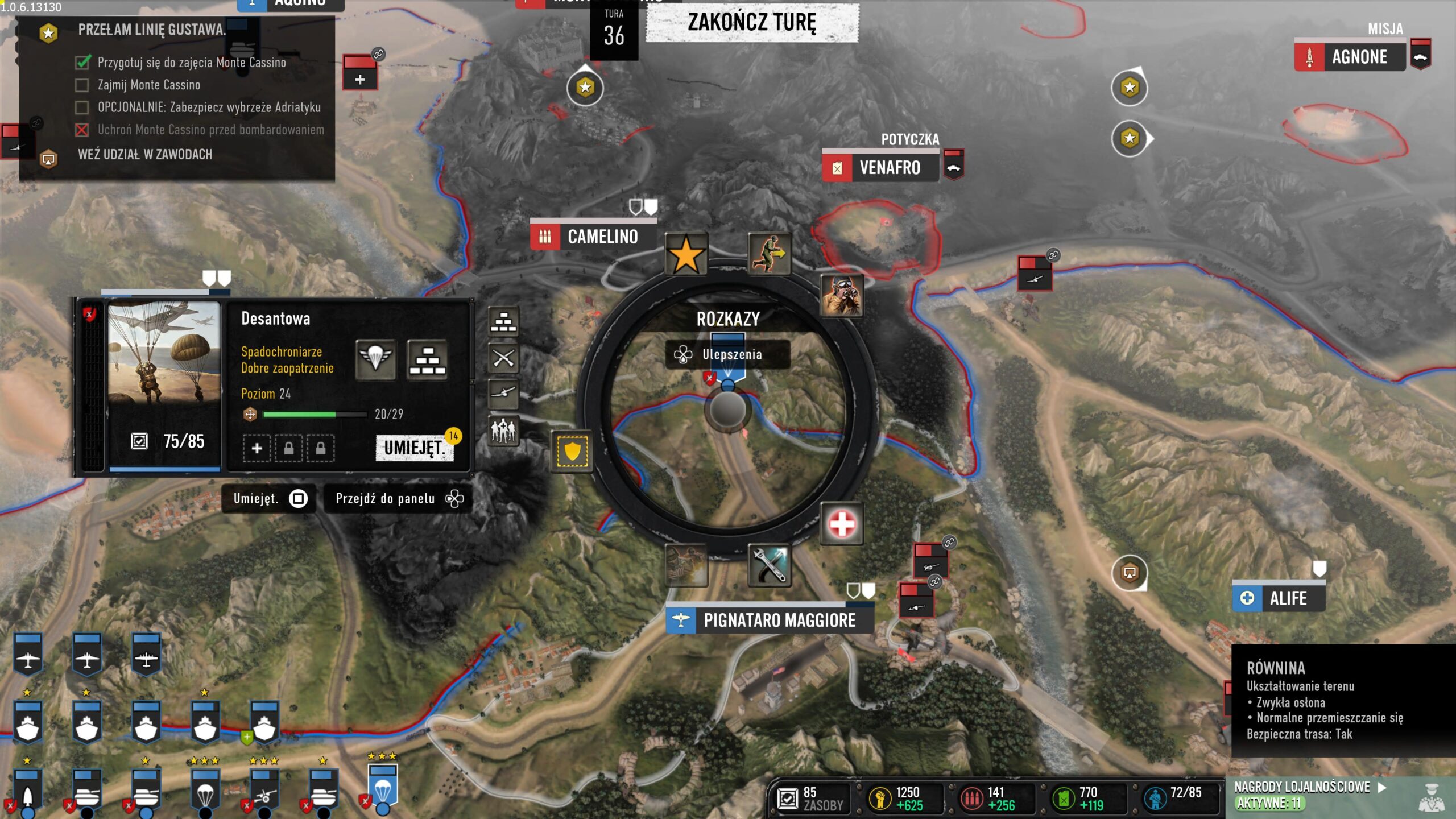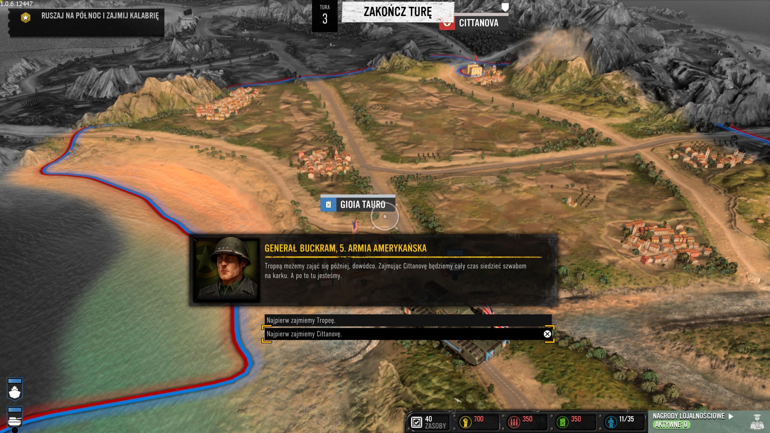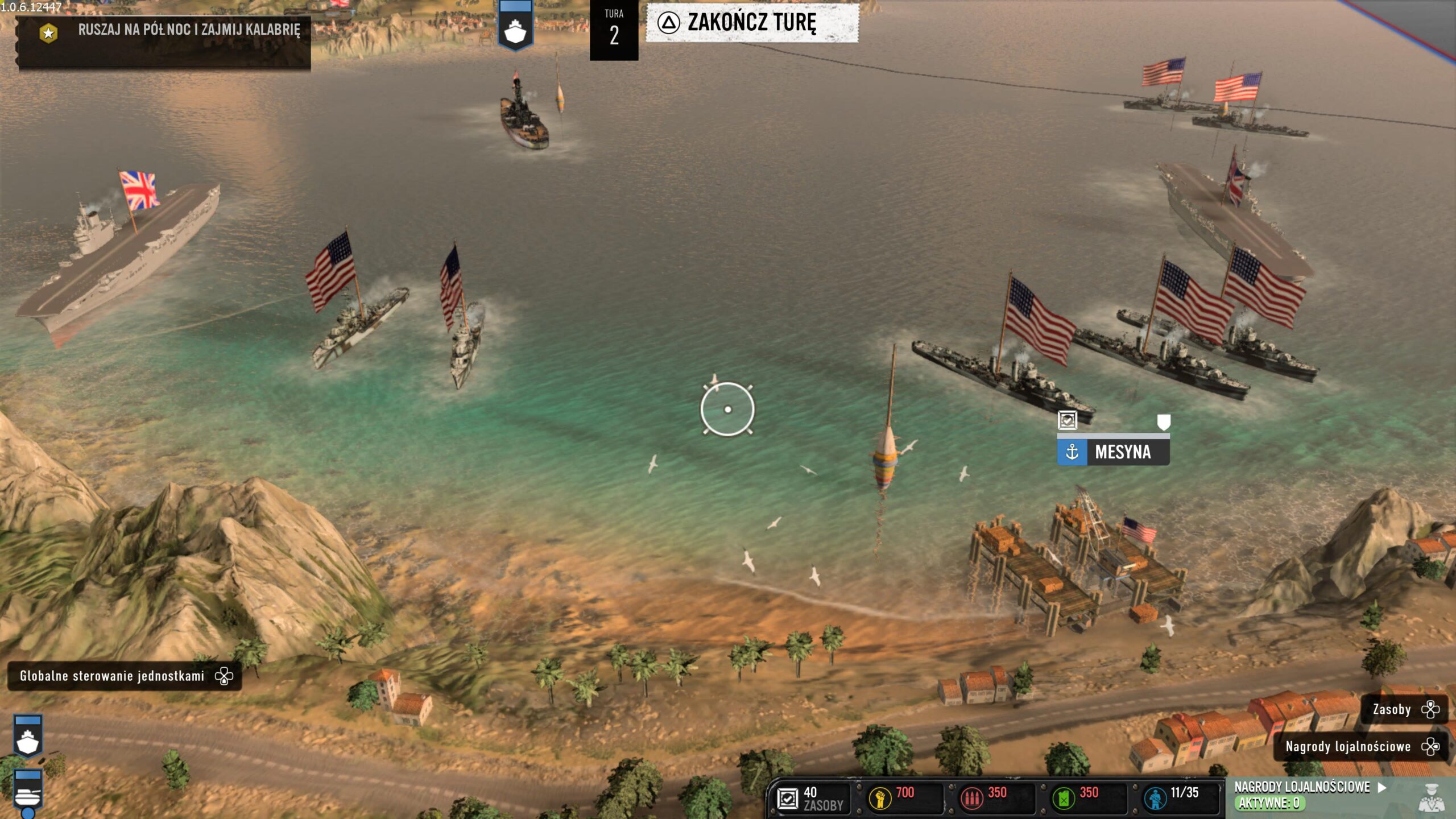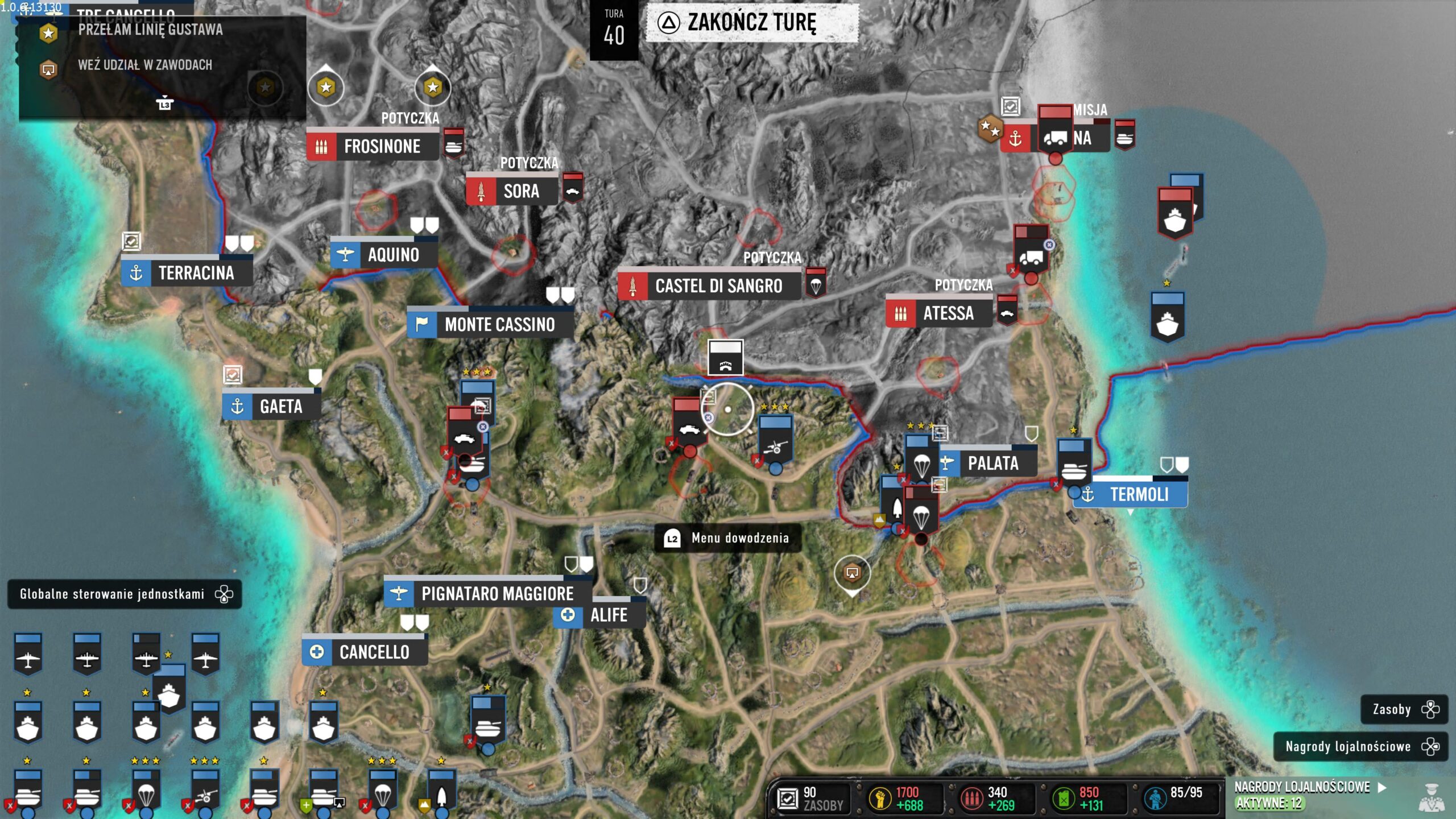 Kampania włoska zawiera to, o czym wspominałem w pierwszym akapicie recenzji. Łączy RTS-a ze strategią turową. Połączono w niej klasyczne starcia z ogromną taktyczną mapą rodem z serii Total War. W tej formie rozgrywki przesuwamy nasze jednostki po ogromnej mapie, zdobywając miasta i punkty z zaopatrzeniem, przejmujemy lotniska, czy porty. Dowodzimy siłami naziemnymi, powietrznymi oraz morskimi. Na start otrzymujemy okręt wojenny i możemy nim ostrzeliwać miasta, które chcemy przejąć. Dzięki temu będą łatwiejsze do podbicia. Dodatkowo w porcie możemy wyprodukować niszczyciela do zwalczania innych morskich jednostek lub lotniskowiec. Jego samoloty będą wykonywały lot zwiadowczy albo naloty bombowe.