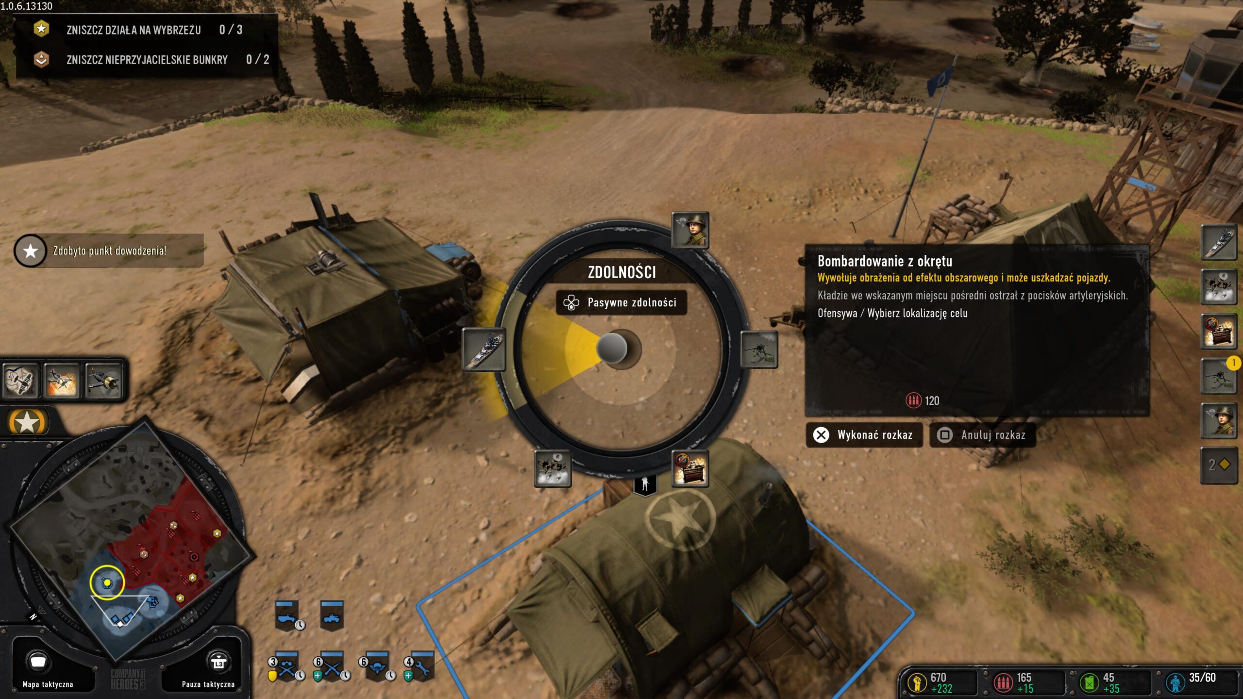 Dodatkowo oprócz produkcji i manewrowania jednostkami nauczymy korzystać się z umiejętności dowódcy oraz umiejętności specjalnych. Te pierwsze znajdziemy po lewej stronie ekranu i pozwolą nam wezwać na pole bitwy małe samoloty lub jednostki wojskowe bez czekania na ich produkcję. Natomiast po prawej stronie mamy potężne umiejętności, jak choćby wezwanie różnych nalotów z powietrza, czy dużych jednostek takich jak czołgi. W operacjach Deutsches Afrikakorps zdolności i umiejętności są z góry przypisane. Z kolei w kampanii włoskiej sami będziemy mogli nimi zarządzać i wybrać te, które nam najbardziej odpowiadają.