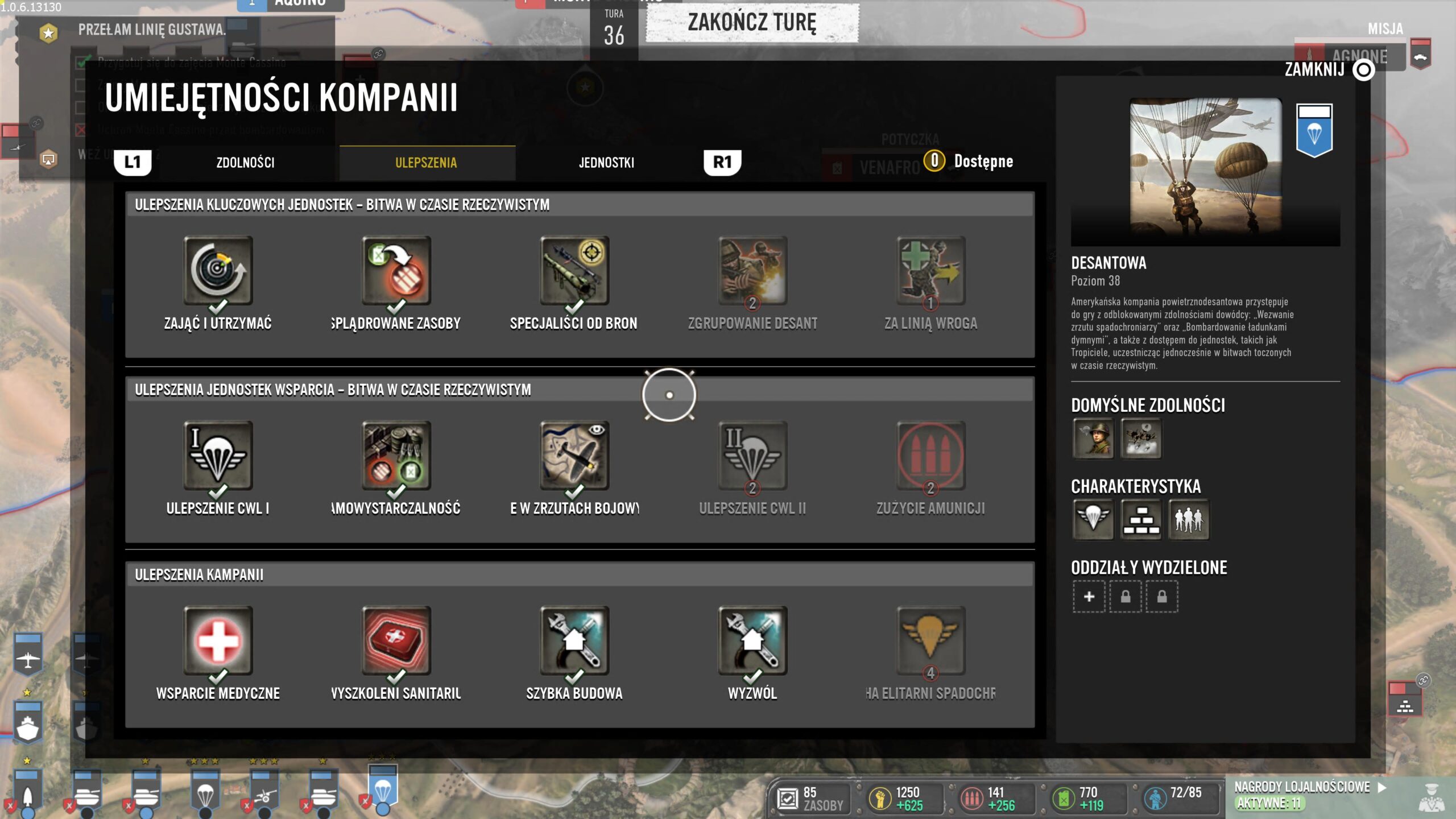 Każda jednostka, która porusza się po ogromnej włoskiej mapie, zdobywa punkty doświadczenia za każdą potyczkę lub zebrane surowce. Klikając na wybraną armię, przytrzymujemy L2. Wtedy wywołamy okrągłe menu, w którym znajdziemy rozkazy. Następnie klikamy DPad w lewo i przechodzimy do umiejętności kompanii. Tam mamy aż trzy zakładki: zdolności, ulepszenia oraz jednostki. Pierwsza oferuje nam, to, co możemy wezwać spoza mapy, druga ulepszenia wszystkiego, co posiadamy. Trzecia to oczywiście dostęp do coraz potężniejszych armii, które możemy wyprodukować. W zależności od tego, czy poruszamy się po mapie piechotą, artylerią czy jednostką zmechanizowaną, to w drzewku umiejętności znajdziemy zupełnie inne rzeczy do odblokowania.